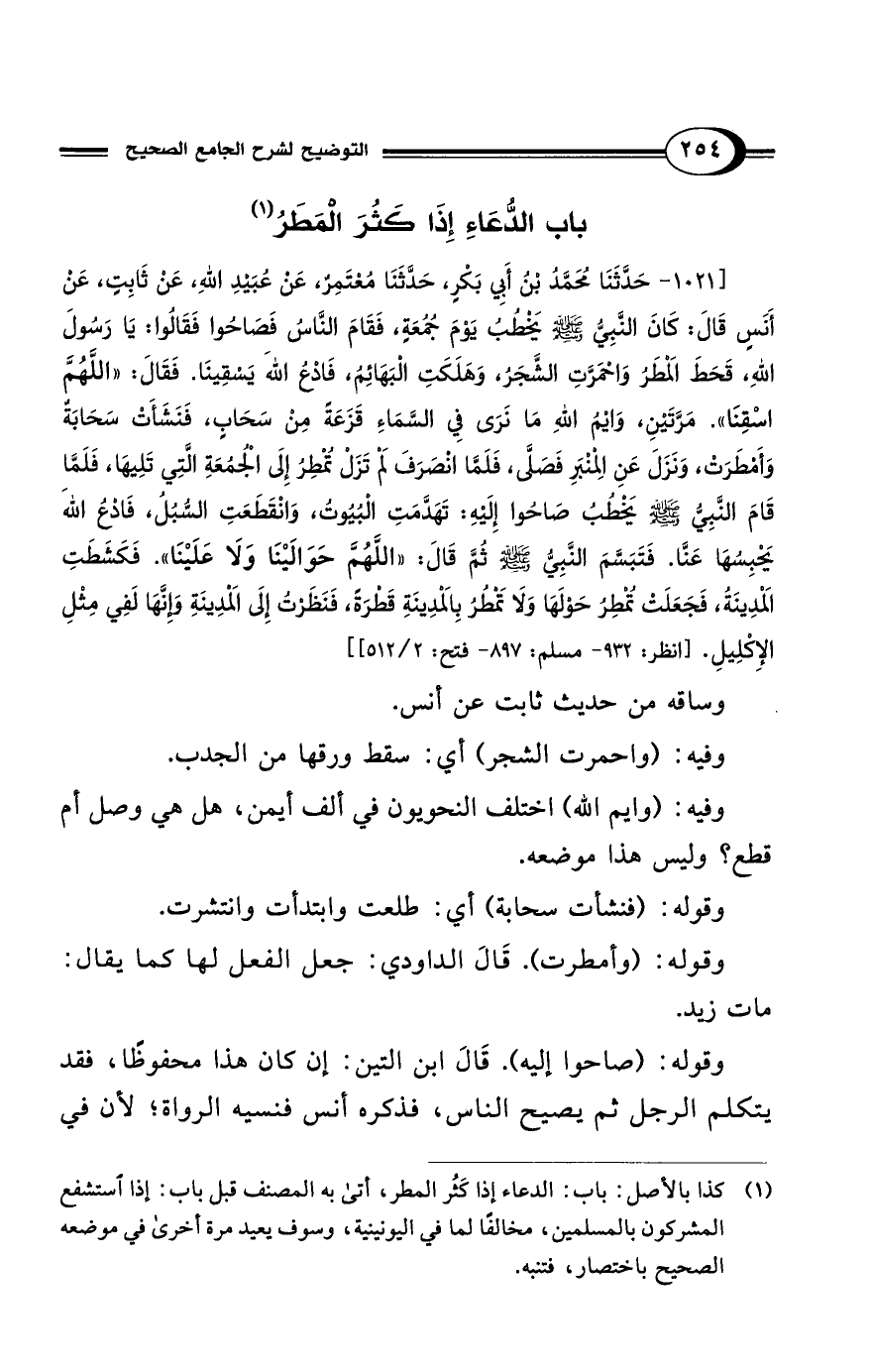 [1021 - حَدَّثَنَا مُحَمَّدُ بْنُ أَبِي بَكْرٍ، حَدَّثَنَا مُعْتَمِرٌ، عَنْ عُبَيْدِ اللهِ، عَنْ ثَابِتٍ، عَنْ أَنَسٍ قَالَ: كَانَ النَّبِيُّ - صلى الله عليه وسلم - يَخْطُبُ يَوْمَ جُمُعَةٍ، فَقَامَ النَّاسُ فَصَاحُوا فَقَالُوا: يَا رَسُولَ اللهِ، قَحَطَ المَطَرُ وَاحْمَرَّتِ الشَّجَرُ، وَهَلَكَتِ البَهَائِمُ، فَادْعُ الله يَسْقِينَا. فَقَالَ: "اللَّهُمَّ اسْقِنَا". مَرَّتَيْنِ، وَايْمُ اللهِ مَا نَرَى فِي السَّمَاءِ قَزَعَةً مِنْ سَحَابٍ، فَنَشَأَتْ سَحَابَةٌ وَأَمْطَرَتْ، وَنَزَلَ عَنِ المِنْبَرِ فَصَلَّى، فَلَمَّا انْصَرَفَ لَمْ تَزَلْ تُمْطِرُ إِلَى الجُمُعَةِ الَّتِي تَلِيهَا، فَلَمَّا قَامَ النَّبِيُّ - صلى الله عليه وسلم - يَخْطُبُ صَاحُوا إِلَيْهِ: تَهَدَّمَتِ البُيُوتُ، وَانْقَطَعَتِ السُّبُلُ، فَادْعُ الله يَحْبِسُهَا عَنَّا. فَتَبَسَّمَ النَّبِيُّ - صلى الله عليه وسلم - ثُمَّ قَالَ: "اللَّهُمَّ حَوَالَيْنَا وَلاَ عَلَيْنَا". فَكُشِطَتِ المَدِينَةُ، فَجَعَلَتْ تُمْطِرُ حَوْلَهَا وَلاَ تَمْطُرُ بِالمَدِينَةِ قَطْرَةً، فَنَظَرْتُ إِلَى المَدِينَةِ وَإِنَّهَا لَفِي مِثْلِ الإِكْلِيلِ. [انظر: 932 - مسلم: 897 - فتح: 2/ 512]]