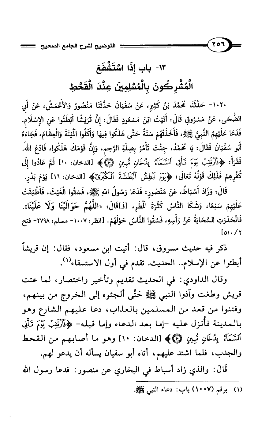 1020 - حَدَّثَنَا مُحَمَّدُ بْنُ كَثِيرٍ، عَنْ سُفْيَانَ حَدَّثَنَا مَنْصُورٌ وَالأَعْمَشُ، عَنْ أَبِي الضُّحَى، عَنْ مَسْرُوقٍ قَالَ: أَتَيْتُ ابْنَ مَسْعُودٍ فَقَالَ: إِنَّ قُرَيْشًا أَبْطَئُوا عَنِ الإِسْلاَمِ. فَدَعَا عَلَيْهِمُ النَّبِيُّ - صلى الله عليه وسلم -، فَأَخَذَتْهُمْ سَنَةٌ حَتَّى هَلَكُوا فِيهَا وَأَكَلُوا المَيْتَةَ وَالعِظَامَ، فَجَاءَهُ أَبُو سُفْيَانَ فَقَالَ: يَا مُحَمَّدُ، جِئْتَ تَأْمُرُ بِصِلَةِ الرَّحِمِ، وَإِنَّ قَوْمَكَ هَلَكُوا، فَادْعُ الله. فَقَرَأَ: {فَارْتَقِبْ يَوْمَ تَأْتِي السَّمَاءُ بِدُخَانٍ مُبِينٍ (10)} [الدخان: 10] ثُمَّ عَادُوا إِلَى كُفْرِهِمْ فَذَلِكَ قَوْلُهُ تَعَالَى: {يَوْمَ نَبْطِشُ الْبَطْشَةَ الْكُبْرَى} [الدخان: 16] يَوْمَ بَدْرٍ. قَالَ: وَزَادَ أَسْبَاطٌ، عَنْ مَنْصُورٍ: فَدَعَا رَسُولُ اللهِ - صلى الله عليه وسلم -، فَسُقُوا الغَيْثَ، فَأَطْبَقَتْ عَلَيْهِمْ سَبْعًا، وَشَكَا النَّاسُ كَثْرَةَ المَطَرِ، [فَ] قَالَ: "اللَّهُمَّ حَوَالَيْنَا وَلاَ عَلَيْنَا". فَانْحَدَرَتِ السَّحَابَةُ عَنْ رَأْسِهِ، فَسُقُوا النَّاسُ حَوْلَهُمْ. [انظر: 1007 - مسلم: 2798 - فتح 2/ 510]