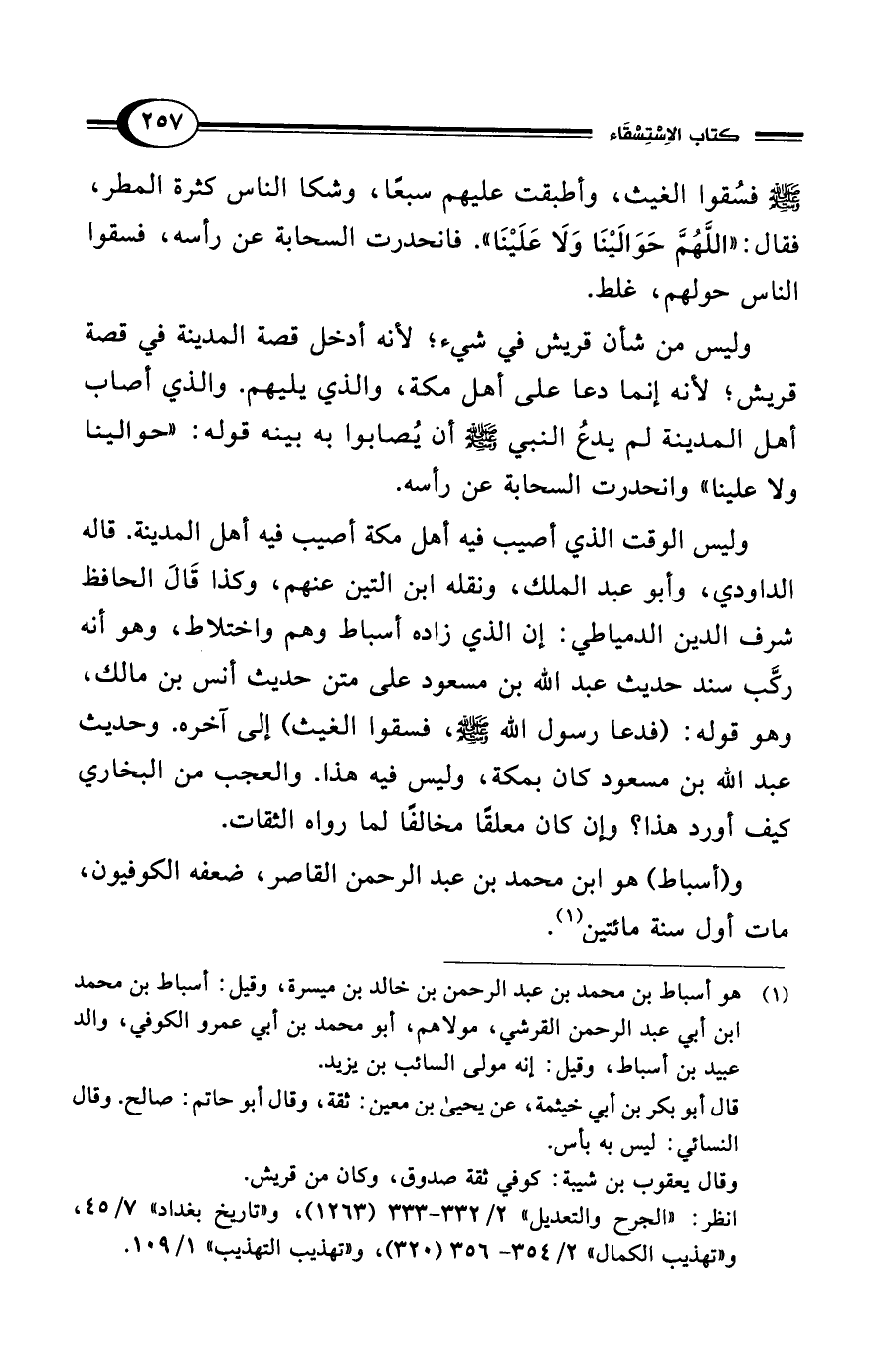 وليس الوقت الذي أصيب فيه أهل مكة أصيب فيه أهل المدينة. قاله الداودي، وأبو عبد الملك، ونقله ابن التين عنهم، وكذا قَالَ الحافظ شرف الدين الدمياطي: إن الذي زاده أسباط وهم واختلاط، وهو أنه ركَّب سند حديث عبد الله بن مسعود على متن حديث أنس بن مالك، وهو قوله: (فدعا رسول الله- صلى الله عليه وسلم -، فسقوا الغيث) إلى آخره. وحديث عبد الله بن مسعود كان بمكة، وليس فيه هذا. والعجب من البخاري كيف أورد هذا؟ وإن كان معلقًا مخالفًا لما رواه الثقات.