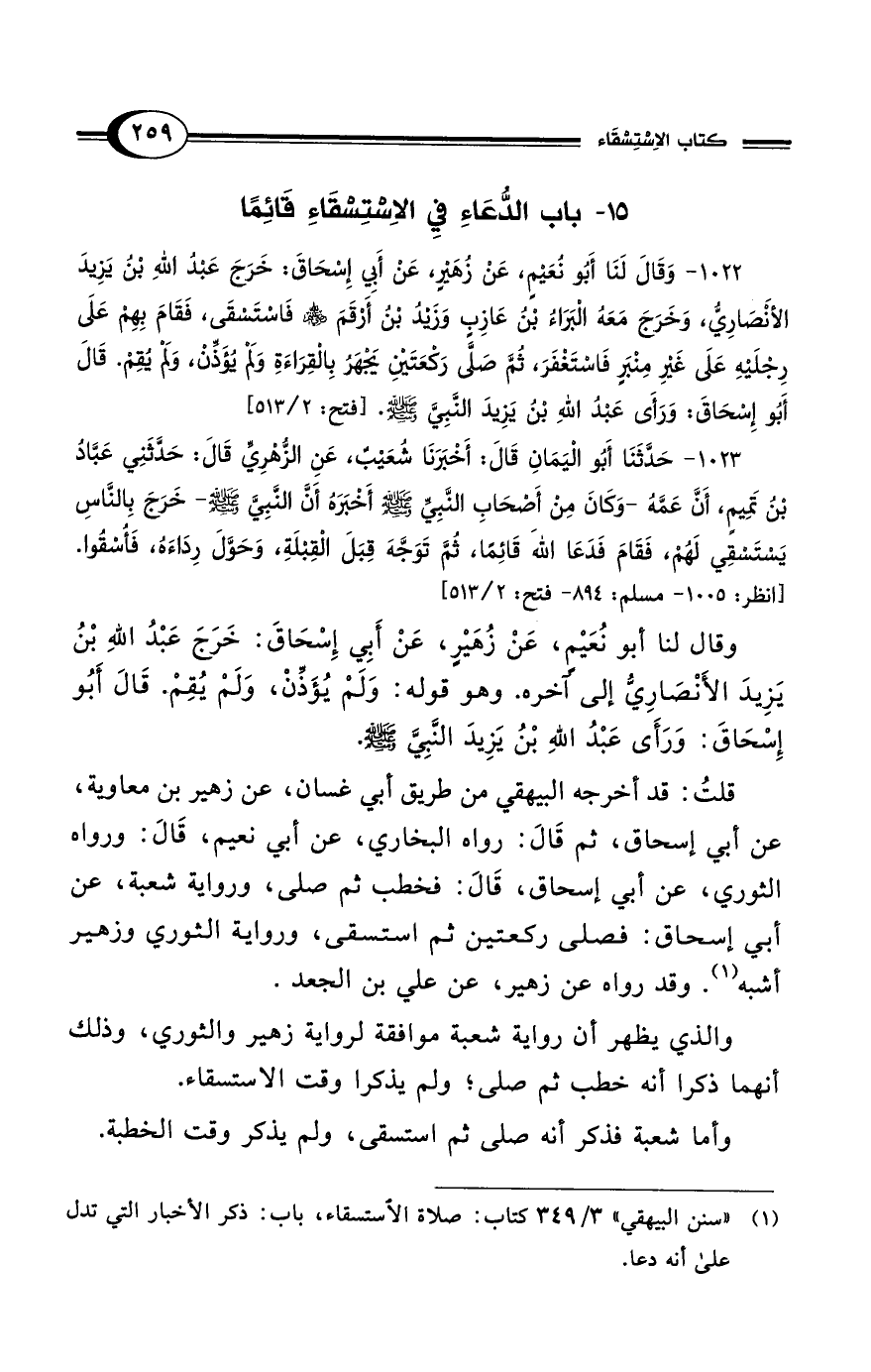 1022 - وَقَالَ لَنَا أَبُو نُعَيْمٍ، عَنْ زُهَيْرٍ، عَنْ أَبِي إِسْحَاقَ: خَرَجَ عَبْدُ اللهِ بْنُ يَزِيدَ الأَنْصَارِيُّ، وَخَرَجَ مَعَهُ البَرَاءُ بْنُ عَازِبٍ وَزَيْدُ بْنُ أَرْقَمَ رضي الله عنهم فَاسْتَسْقَى، فَقَامَ بِهِمْ عَلَى رِجْلَيْهِ عَلَى غَيْرِ مِنْبَرٍ فَاسْتَغْفَرَ، ثُمَّ صَلَّى رَكْعَتَيْنِ يَجْهَرُ بِالقِرَاءَةِ وَلَمْ يُؤَذِّنْ، وَلَمْ يُقِمْ. قَالَ أَبُو إِسْحَاقَ: وَرَأَى عَبْدُ اللهِ بْنُ يَزِيدَ النَّبِيَّ - صلى الله عليه وسلم -. [فتح: 2/ 513]