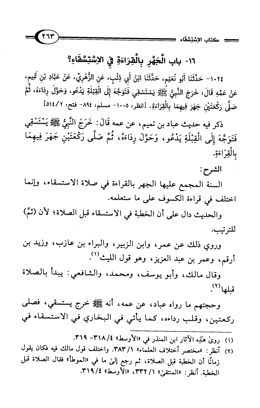 1024 - حَدَّثَنَا أَبُو نُعَيْمٍ، حَدَّثَنَا ابْنُ أَبِي ذِئْبٍ، عَنِ الزُّهْرِيِّ، عَنْ عَبَّادِ بْنِ تَمِيمٍ، عَنْ عَمِّهِ قَالَ: خَرَجَ النَّبِيُّ - صلى الله عليه وسلم - يَسْتَسْقِي فَتَوَجَّهَ إِلَى القِبْلَةِ يَدْعُو، وَحَوَّلَ رِدَاءَهُ، ثُمَّ صَلَّى رَكْعَتَيْنِ جَهَرَ فِيهِمَا بِالقِرَاءَةِ. [انظر: 1005 - مسلم: 894 - فتح: 2/ 514]