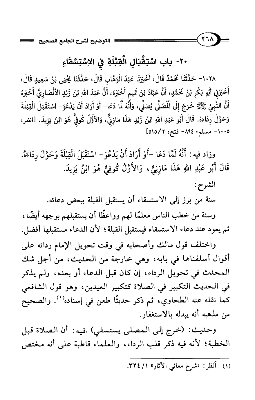 1028 - حَدَّثَنَا مُحَمَّدٌ قَالَ: أَخْبَرَنَا عَبْدُ الوَهَّابِ قَالَ: حَدَّثَنَا يَحْيَى بْنُ سَعِيدٍ قَالَ: أَخْبَرَنِي أَبُو بَكْرِ بْنُ مُحَمَّدٍ، أَنَّ عَبَّادَ بْنَ تَمِيمٍ أَخْبَرَهُ، أَنَّ عَبْدَ اللهِ بْنَ زَيْدٍ الأَنْصَارِيَّ أَخْبَرَهُ أَنَّ النَّبِيَّ - صلى الله عليه وسلم - خَرَجَ إِلَى المُصَلَّى يُصَلِّي، وَأَنَّهُ لَمَّا دَعَا -أَوْ أَرَادَ أَنْ يَدْعُوَ- اسْتَقْبَلَ القِبْلَةَ وَحَوَّلَ رِدَاءَهُ. قَالَ أَبُو عَبْدِ اللهِ ابْنُ زَيْدٍ هَذَا مَازِنِيٌّ، وَالأَوَّلُ كُوفِيٌّ هُوَ ابْنُ يَزِيدَ. [انظر: 1005 - مسلم: 894 - فتح: 2/ 515]