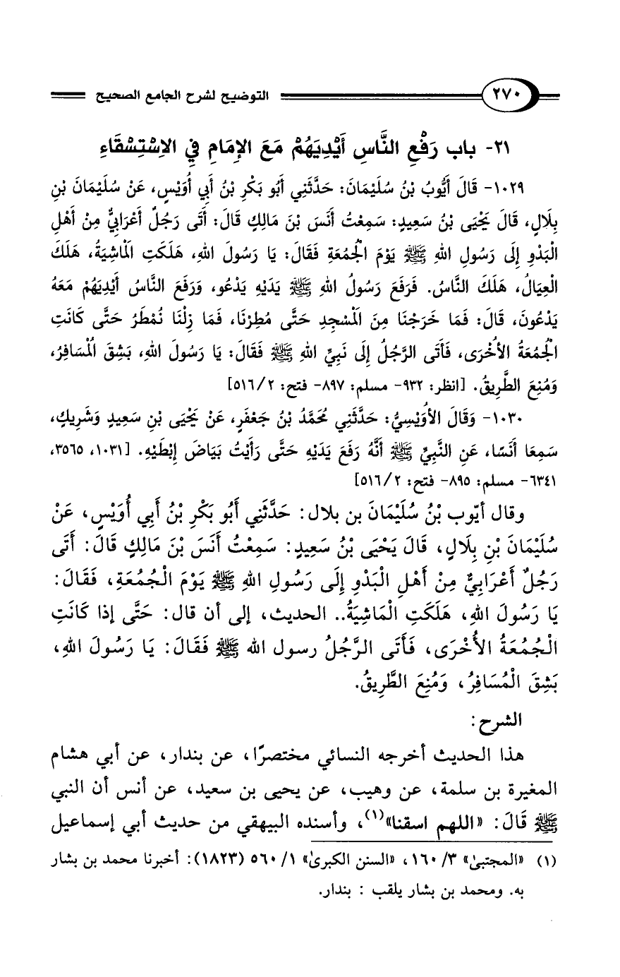 1029 - قَالَ أَيُّوبُ بْنُ سُلَيْمَانَ: حَدَّثَنِي أَبُو بَكْرِ بْنُ أَبِي أُوَيْسٍ، عَنْ سُلَيْمَانَ بْنِ بِلاَلٍ، قَالَ يَحْيَى بْنُ سَعِيدٍ: سَمِعْتُ أَنَسَ بْنَ مَالِكٍ قَالَ: أَتَى رَجُلٌ أَعْرَابِيٌّ مِنْ أَهْلِ البَدْوِ إِلَى رَسُولِ اللهِ - صلى الله عليه وسلم - يَوْمَ الجُمُعَةِ فَقَالَ: يَا رَسُولَ اللهِ، هَلَكَتِ المَاشِيَةُ، هَلَكَ العِيَالُ، هَلَكَ النَّاسُ. فَرَفَعَ رَسُولُ اللهِ - صلى الله عليه وسلم - يَدَيْهِ يَدْعُو، وَرَفَعَ النَّاسُ أَيْدِيَهُمْ مَعَهُ يَدْعُونَ، قَالَ: فَمَا خَرَجْنَا مِنَ المَسْجِدِ حَتَّى مُطِرْنَا، فَمَا زِلْنَا نُمْطَرُ حَتَّى كَانَتِ الجُمُعَةُ الأُخْرَى، فَأَتَى الرَّجُلُ إِلَى نَبِيِّ اللهِ - صلى الله عليه وسلم - فَقَالَ: يَا رَسُولَ اللهِ، بَشِقَ المُسَافِرُ، وَمُنِعَ الطَّرِيقُ. [انظر: 932 - مسلم: 897 - فتح: 2/ 516]
