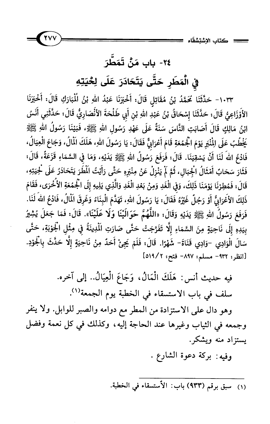 1033 - حَدَّثَنَا مُحَمَّدُ بْنُ مُقَاتِلٍ قَالَ: أَخْبَرَنَا عَبْدُ اللهِ بْنُ المُبَارَكِ قَالَ: أَخْبَرَنَا الأَوْزَاعِيُّ قَالَ: حَدَّثَنَا إِسْحَاقُ بْنُ عَبْدِ اللهِ بْنِ أَبِي طَلْحَةَ الأَنْصَارِيُّ قَالَ: حَدَّثَنِي أَنَسُ بْنُ مَالِكٍ قَالَ أَصَابَتِ النَّاسَ سَنَةٌ عَلَى عَهْدِ رَسُولِ اللهِ - صلى الله عليه وسلم -، فَبَيْنَا رَسُولُ اللهِ - صلى الله عليه وسلم - يَخْطُبُ عَلَى المِنْبَرِ يَوْمَ الجُمُعَةِ قَامَ أَعْرَابِيٌّ فَقَالَ: يَا رَسُولَ اللهِ، هَلَكَ المَالُ، وَجَاعَ العِيَالُ، فَادْعُ الله لَنَا أَنْ يَسْقِيَنَا. قَالَ: فَرَفَعَ رَسُولُ اللهِ - صلى الله عليه وسلم - يَدَيْهِ، وَمَا فِي السَّمَاءِ قَزَعَةٌ، قَالَ: فَثَارَ سَحَابٌ أَمْثَالُ الجِبَالِ، ثُمَّ لَمْ يَنْزِلْ عَنْ مِنْبَرِهِ حَتَّى رَأَيْتُ المَطَرَ يَتَحَادَرُ عَلَى لِحْيَتِهِ، قَالَ: فَمُطِرْنَا يَوْمَنَا ذَلِكَ، وَفِي الغَدِ وَمِنْ بَعْدِ الغَدِ وَالَّذِي يَلِيهِ إِلَى الجُمُعَةِ الأُخْرَى، فَقَامَ ذَلِكَ الأَعْرَابِيُّ أَوْ رَجُلٌ غَيْرُهُ فَقَالَ: يَا رَسُولَ اللهِ، تَهَدَّمَ البِنَاءُ وَغَرِقَ المَالُ، فَادْعُ الله لَنَا. فَرَفَعَ رَسُولُ اللهِ - صلى الله عليه وسلم - يَدَيْهِ وَقَالَ: "اللَّهُمَّ حَوَالَيْنَا وَلاَ عَلَيْنَا". قَالَ: فَمَا جَعَلَ يُشِيرُ بِيَدِهِ إِلَى نَاحِيَةٍ مِنَ السَّمَاءِ إِلاَّ تَفَرَّجَتْ حَتَّى صَارَتِ المَدِينَةُ فِي مِثْلِ الجَوْبَةِ، حَتَّى سَالَ الوَادِى -وَادِي قَنَاةَ- شَهْرًا. قَالَ: فَلَمْ يَجِئْ أَحَدٌ مِنْ نَاحِيَةٍ إِلاَّ حَدَّثَ بِالجَوْدِ. [انظر: 932 - مسلم: 897 - فتح: 2/ 519]