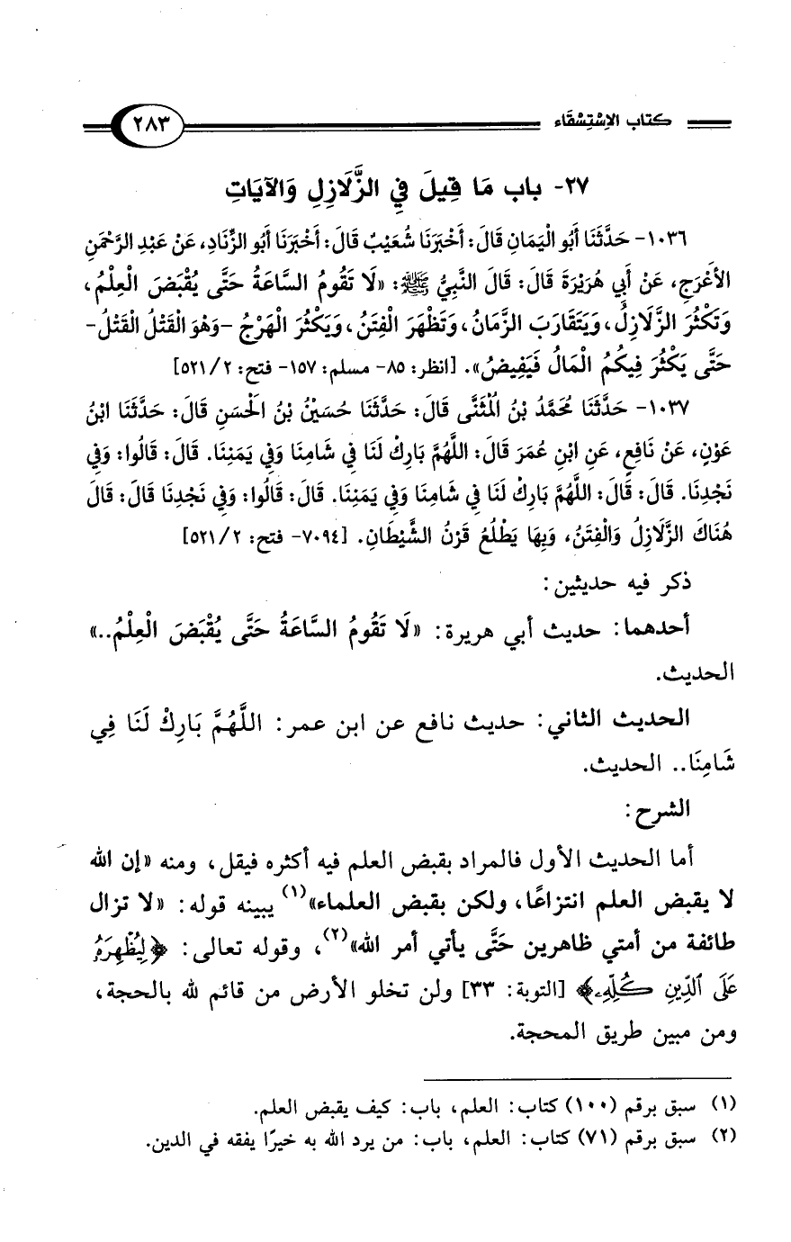 1036 - حَدَّثَنَا أَبُو اليَمَانِ قَالَ: أَخْبَرَنَا شُعَيْبٌ قَالَ: أَخْبَرَنَا أَبُو الزِّنَادِ، عَنْ عَبْدِ الرَّحْمَنِ الأَعْرَجِ، عَنْ أَبِي هُرَيْرَةَ قَالَ: قَالَ النَّبِيُّ - صلى الله عليه وسلم -: "لاَ تَقُومُ السَّاعَةُ حَتَّى يُقْبَضَ العِلْمُ، وَتَكْثُرَ الزَّلاَزِلُ، وَيَتَقَارَبَ الزَّمَانُ، وَتَظْهَرَ الفِتَنُ، وَيَكْثُرَ الهَرْجُ -وَهْوَ القَتْلُ القَتْلُ- حَتَّى يَكْثُرَ فِيكُمُ المَالُ فَيَفِيضُ". [انظر: 85 - مسلم: 157 - فتح: 2/ 521]