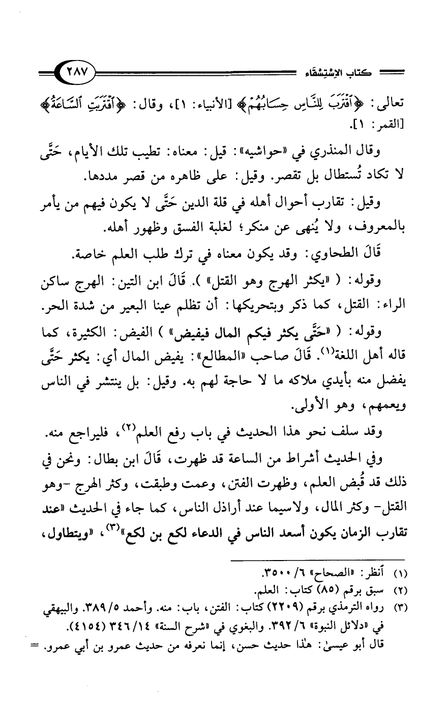 تعالى: {اقْتَرَبَ لِلنَّاسِ حِسَابُهُمْ} [الأنبياء:1]، وقال: {قْتَرَبَتِ السَّاعَةُ} [القمر:1].