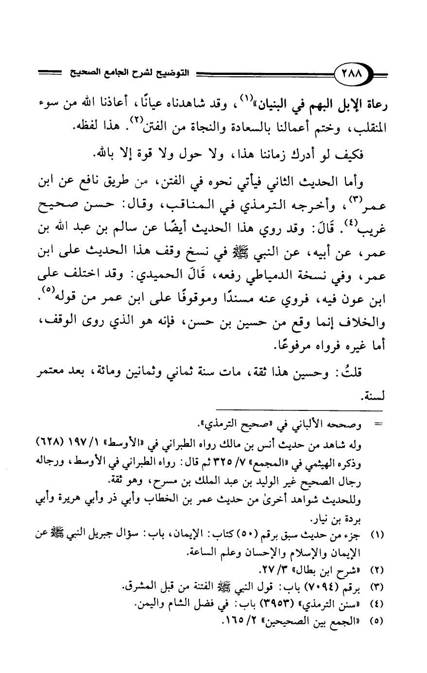 وأما الحديث الثاني فيأتي نحوه في الفتن، من طريق نافع عن ابن عمر (¬3)، وأخرجه الترمذي في المناقب، وقال: حسن صحيح غريب (¬4). قَالَ: وقد روي هذا الحديث أيضًا عن سالم بن عبد الله بن عمر، عن أبيه، عن النبي - صلى الله عليه وسلم - في نسخ وقف هذا الحديث على ابن عمر، وفي نسخة الدمياطي رفعه، قَالَ الحميدي: وقد اختلف على ابن عون فيه، فروي عنه مسندًا وموقوفًا على ابن عمر من قوله (¬5).