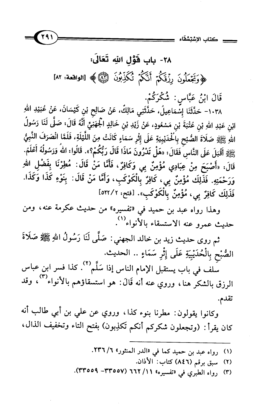 1038 - حَدَّثَنَا إِسْمَاعِيلُ، حَدَّثَنِي مَالِكٌ، عَنْ صَالِحِ بْنِ كَيْسَانَ، عَنْ عُبَيْدِ اللهِ بْنِ عَبْدِ اللهِ بْنِ عُتْبَةَ بْنِ مَسْعُودٍ، عَنْ زَيْدِ بْنِ خَالِدٍ الجُهَنِيِّ أَنَّهُ قَالَ: صَلَّى لَنَا رَسُولُ اللهِ - صلى الله عليه وسلم - صَلاَةَ الصُّبْحِ بِالحُدَيْبِيَةِ عَلَى إِثْرِ سَمَاءٍ كَانَتْ مِنَ اللَّيْلَةِ، فَلَمَّا انْصَرَفَ النَّبِيُّ - صلى الله عليه وسلم - أَقْبَلَ عَلَى النَّاسِ فَقَالَ: "هَلْ تَدْرُونَ مَاذَا قَالَ رَبُّكُمْ؟ ". قَالُوا: اللهُ وَرَسُولُهُ أَعْلَمُ. قَالَ: "أَصْبَحَ مِنْ عِبَادِي مُؤْمِنٌ بِي وَكَافِرٌ، فَأَمَّا مَنْ قَالَ: مُطِرْنَا بِفَضْلِ اللهِ وَرَحْمَتِهِ. فَذَلِكَ مُؤْمِنٌ بِي، كَافِرٌ بِالكَوْكَبِ، وَأَمَّا مَنْ قَالَ: بِنَوْءِ كَذَا وَكَذَا. فَذَلِكَ كَافِرٌ بِي مُؤْمِنٌ بِالكَوْكَبِ". [فتح: 2/ 522]