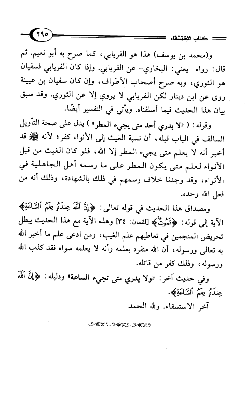ومصداق هذا الحديث في قوله تعالى: {إِنَّ اللَّهَ عِنْدَهُ عِلْمُ السَّاعَةِ} الآية إلى قوله: {تَمُوتُ} [لقمان: 34] وهذه الآية مع هذا الحديث يبطل تحريض المنجمين في تعاطيهم علم الغيب، ومن ادعى علم ما أخبر الله به تعالى ورسوله، أن الله منفرد بعلمه وأنه لا يعلمه سواه فقد كذب الله ورسوله، وذلك كفر من قائله.