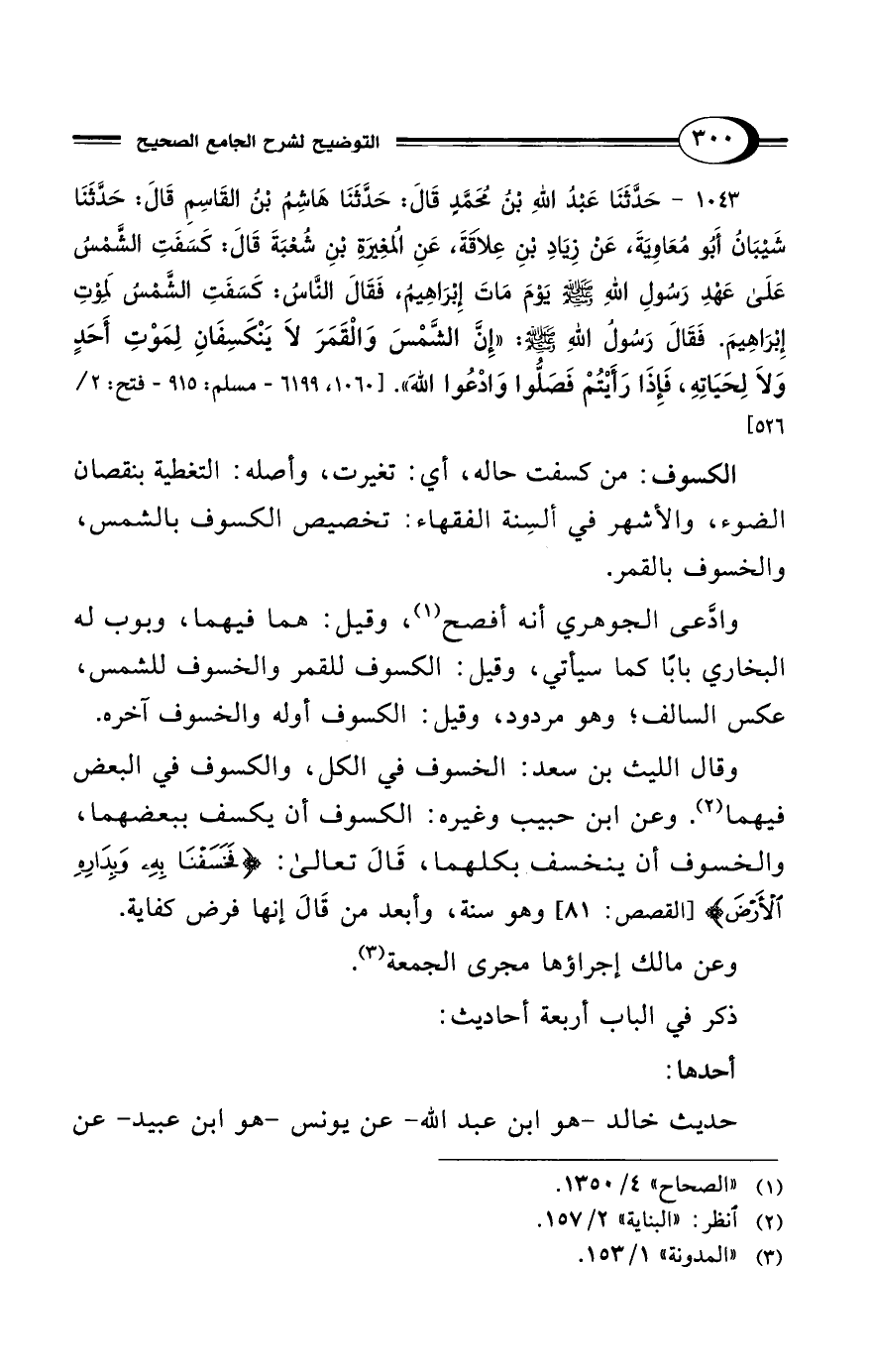 1043 - حَدَّثَنَا عَبْدُ اللهِ بْنُ مُحَمَّدٍ قَالَ: حَدَّثَنَا هَاشِمُ بْنُ القَاسِمِ قَالَ: حَدَّثَنَا شَيْبَانُ أَبُو مُعَاوِيَةَ، عَنْ زِيَادِ بْنِ عِلاَقَةَ، عَنِ المُغِيرَةِ بْنِ شُعْبَةَ قَالَ: كَسَفَتِ الشَّمْسُ عَلَى عَهْدِ رَسُولِ اللهِ - صلى الله عليه وسلم - يَوْمَ مَاتَ إِبْرَاهِيمُ، فَقَالَ النَّاسُ: كَسَفَتِ الشَّمْسُ لِمَوْتِ إِبْرَاهِيمَ. فَقَالَ رَسُولُ اللهِ - صلى الله عليه وسلم -: "إِنَّ الشَّمْسَ وَالقَمَرَ لاَ يَنْكَسِفَانِ لِمَوْتِ أَحَدٍ وَلاَ لِحَيَاتِهِ، فَإِذَا رَأَيْتُمْ فَصَلُّوا وَادْعُوا اللَّهَ". [1060، 6199 - مسلم: 915 - فتح: 2/ 526]