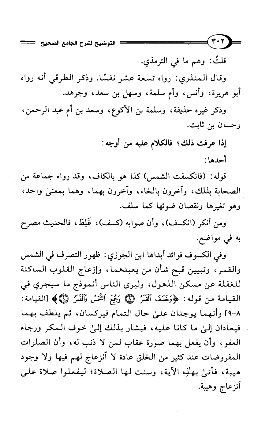 وفي الكسوف فوائد أبداها ابن الجوزي: ظهور التصرف في الشمس والقمر، وتبيين قبح شأن من يعبدهما، وإزعاج القلوب الساكنة للغفلة عن مسكن الذهول، وليرى الناس أنموذج ما سيجري في القيامة من قوله: {وَخَسَفَ القَمَرُ (8) وَجُمِعَ الشَّمْسُ وَالقَمَرُ (9)} [القيامة: 8 - 9] وأنهما يوجدان على حال التمام فيركسان، ثم يلطف بهما فيعادان إلى ما كانا عليه، فيشار بذلك إلى خوف المكر ورجاء العفو، وأن يفعل بهما صورة عقاب لمن لا ذنب له، وأن الصلوات المفروضات عند كثير من الخلق عادة لا انزعاج لفم فيها ولا وجود هيبة، فأتى بهذِه الآية، وسنت لها الصلاة؛ ليفعلوا صلاة على انزعاج وهيبة.