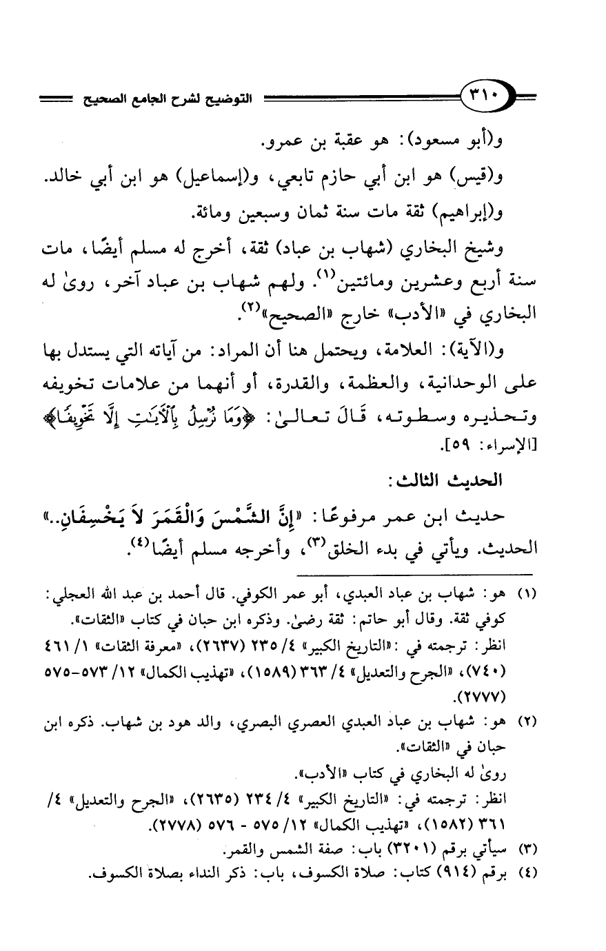 حديث ابن عمر مرفوعًا: "إِنَّ الشمْسَ وَالقَمَرَ لاَ يَخْسِفَانِ .. " الحديث. ويأتي في بدء الخلق (¬3)، وأخرجه مسلم أيضًا (¬4).
