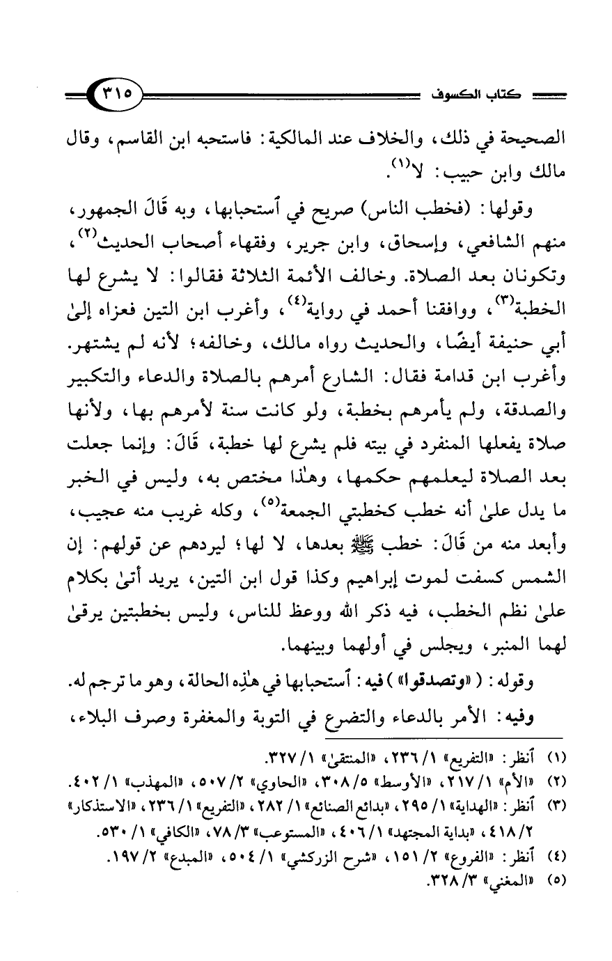 وأغرب ابن قدامة فقال: الشارع أمرهم بالصلاة والدعاء والتكبير والصدقة، ولم يأمرهم بخطبة، ولو كانت سنة لأمرهم بها، ولأنها صلاة يفعلها المنفرد في بيته فلم يشرع لها خطبة، قَالَ: وإنما جعلت بعد الصلاة ليعلمهم حكمها، وهذا مختص به، وليس في الخبر ما يدل على أنه خطب كخطبتى الجمعة (¬5)، وكله غريب منه عجيب، وأبعد منه من قَالَ: خطب - صلى الله عليه وسلم - بعدها، لا لها؛ ليردهم عن قولهم: إن الشمس كسفت لموت إبراهيم وكذا قول ابن التين، يريد أتى بكلام على نظم الخطب، فيه ذكر الله ووعظ للناس، وليس بخطبتين يرقى لهما المنبر، ويجلس في أولهما وبينهما.