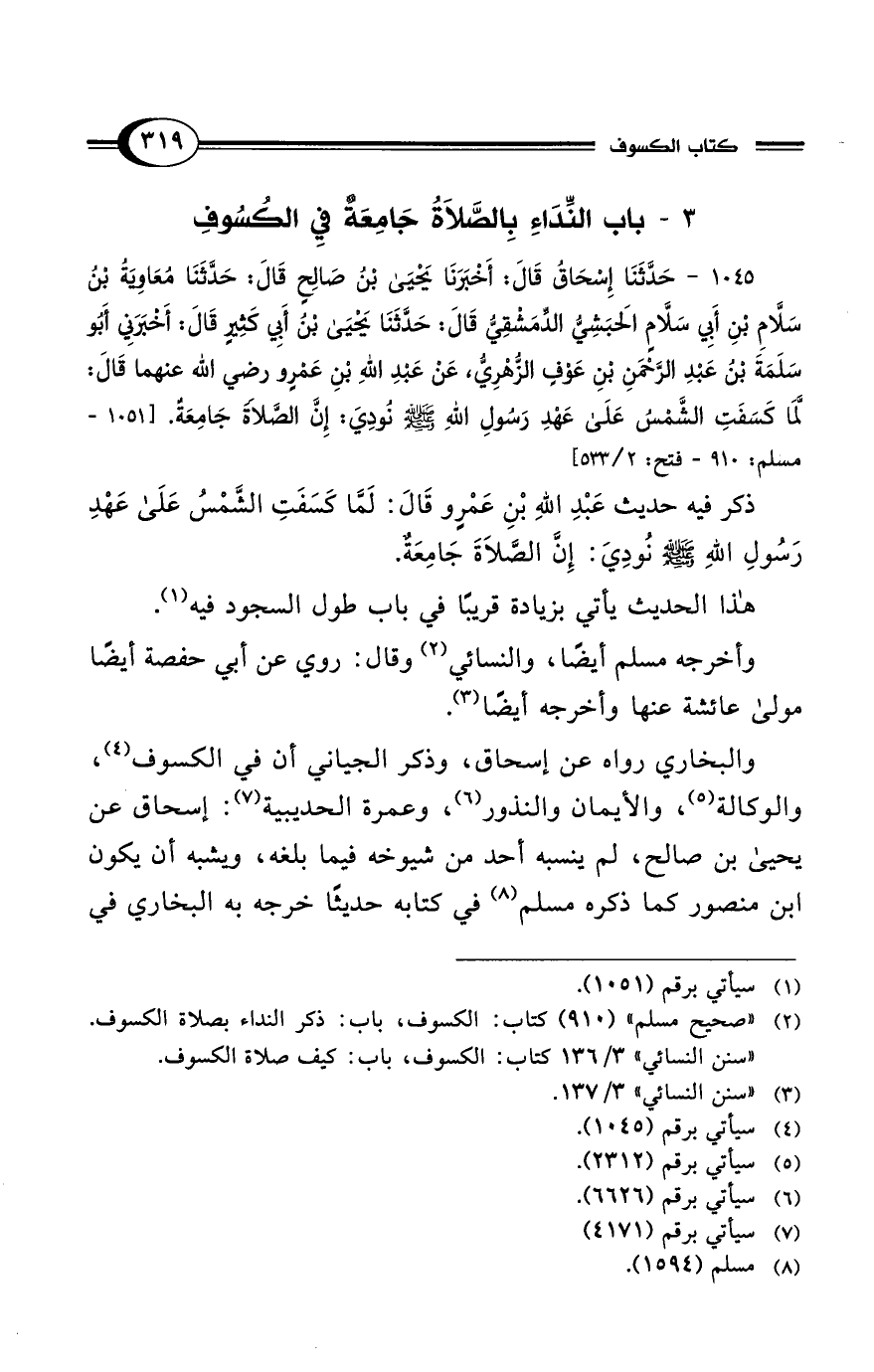 1045 - حَدَّثَنَا إِسْحَاقُ قَالَ: أَخْبَرَنَا يَحْيَى بْنُ صَالِحٍ قَالَ: حَدَّثَنَا مُعَاوِيَةُ بْنُ سَلاَّمِ بْنِ أَبِي سَلاَّمٍ الحَبَشِيُّ الدِّمَشْقِيُّ قَالَ: حَدَّثَنَا يَحْيَى بْنُ أَبِي كَثِيرٍ قَالَ: أَخْبَرَنِي أَبُو سَلَمَةَ بْنُ عَبْدِ الرَّحْمَنِ بْنِ عَوْفٍ الزُّهْرِيُّ، عَنْ عَبْدِ اللهِ بْنِ عَمْرٍو رضي الله عنهما قَالَ: لَمَّا كَسَفَتِ الشَّمْسُ عَلَى عَهْدِ رَسُولِ اللهِ - صلى الله عليه وسلم - نُودِيَ: إِنَّ الصَّلاَةَ جَامِعَةٌ. [1051 - مسلم: 910 - فتح: 2/ 533]