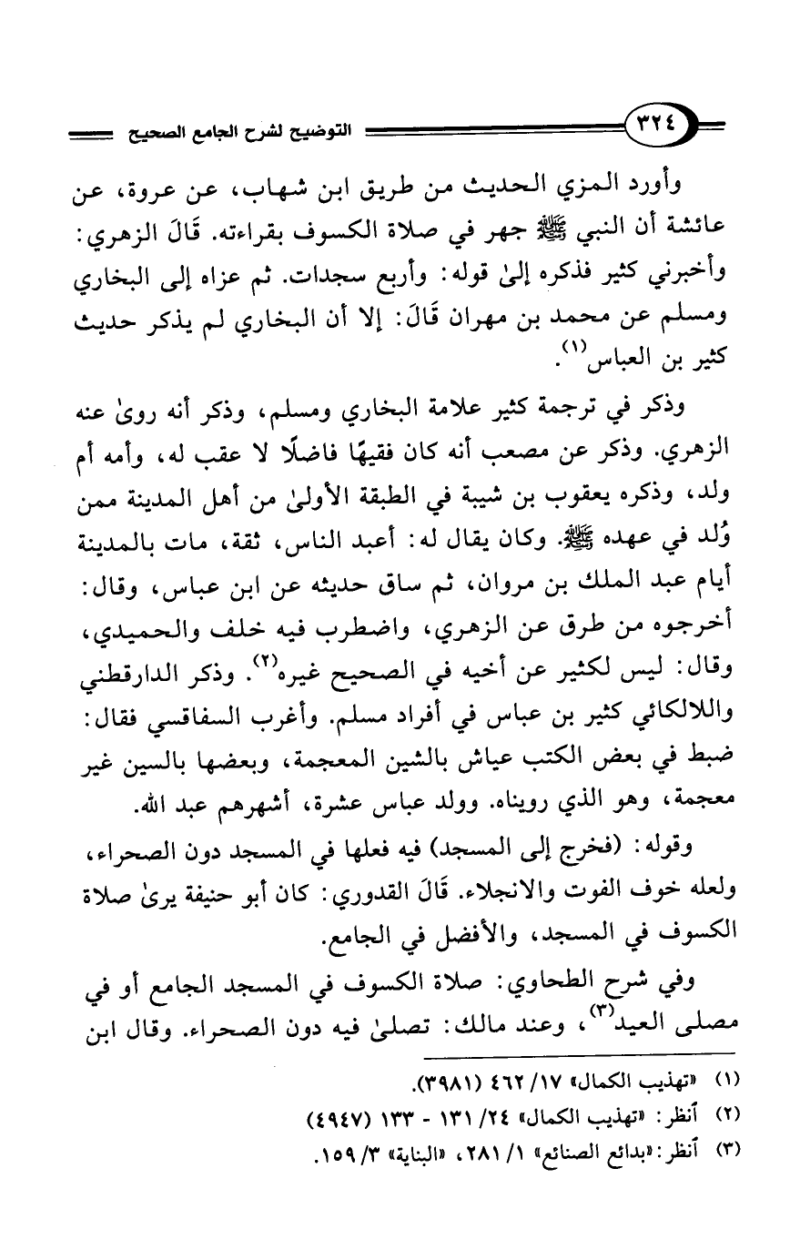 وأورد المزي الحديث من طريق ابن شهاب، عن عروة، عن عائشة أن النبي - صلى الله عليه وسلم - جهر في صلاة الكسوف بقراءته. قَالَ الزهري: وأخبرني كثير فذكره إلى قوله: وأربع سجدات. ثم عزاه إلى البخاري ومسلم عن محمد بن مهران قَالَ: إلا أن البخاري لم يذكر حديث كثير بن العباس (¬1).