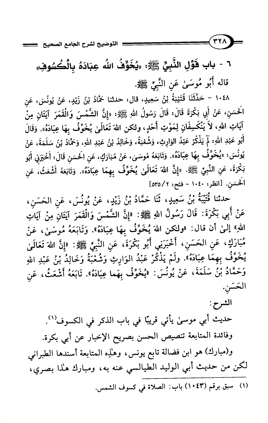 1048 - حَدَّثَنَا قُتَيْبَةُ بْنُ سَعِيدٍ، قَالَ: حَدَّثَنَا حَمَّادُ بْنُ زَيْدٍ، عَنْ يُونُسَ، عَنِ الحَسَنِ، عَنْ أَبِي بَكْرَةَ قَالَ قَالَ: رَسُولُ اللهِ - صلى الله عليه وسلم -: "إِنَّ الشَّمْسَ وَالقَمَرَ آيَتَانِ مِنْ آيَاتِ اللهِ، لاَ يَنْكَسِفَانِ لِمَوْتِ أَحَدٍ، وَلَكِنَّ اللهَ تَعَالَى يُخَوِّفُ بِهَا عِبَادَهُ". وَقَالَ أَبُو عَبْدِ اللهِ: لَمْ يَذْكُرْ عَبْدُ الوَارِثِ، وَشُعْبَةُ، وَخَالِدُ بْنُ عَبْدِ اللهِ، وَحَمَّادُ بْنُ سَلَمَةَ، عَنْ يُونُسَ: "يُخَوِّفُ بِهَا عِبَادَهُ". وَتَابَعَهُ مُوسَى، عَنْ مُبَارَكٍ، عَنِ الحَسَنِ قَالَ: أَخْبَرَنِي أَبُو بَكْرَةَ، عَنِ النَّبِيِّ - صلى الله عليه وسلم -. "إِنَّ اللهَ تَعَالَى يُخَوِّفُ بِهِمَا عِبَادَهُ". وَتَابَعَهُ أَشْعَثُ، عَنِ الحَسَنِ. [انظر: 1040 - فتح: 2/ 535]