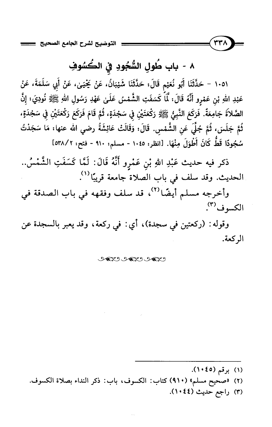 1051 - حَدَّثَنَا أَبُو نُعَيْمٍ قَالَ: حَدَّثَنَا شَيْبَانُ، عَنْ يَحْيَى، عَنْ أَبِي سَلَمَةَ، عَنْ عَبْدِ اللهِ بْنِ عَمْرٍو أَنَّهُ قَالَ: لَمَّا كَسَفَتِ الشَّمْسُ عَلَى عَهْدِ رَسُولِ اللهِ - صلى الله عليه وسلم - نُودِيَ: إِنَّ الصَّلاَةَ جَامِعَةٌ. فَرَكَعَ النَّبِيُّ - صلى الله عليه وسلم - رَكْعَتَيْنِ فِي سَجْدَةٍ، ثُمَّ قَامَ فَرَكَعَ رَكْعَتَيْنِ فِي سَجْدَةٍ، ثُمَّ جَلَسَ، ثُمَّ جُلِّيَ عَنِ الشَّمْسِ. قَالَ: وَقَالَتْ عَائِشَةُ رضي الله عنها: مَا سَجَدْتُ سُجُودًا قَطُّ كَانَ أَطْوَلَ مِنْهَا. [انظر: 1045 - مسلم: 910 - فتح: 2/ 538]