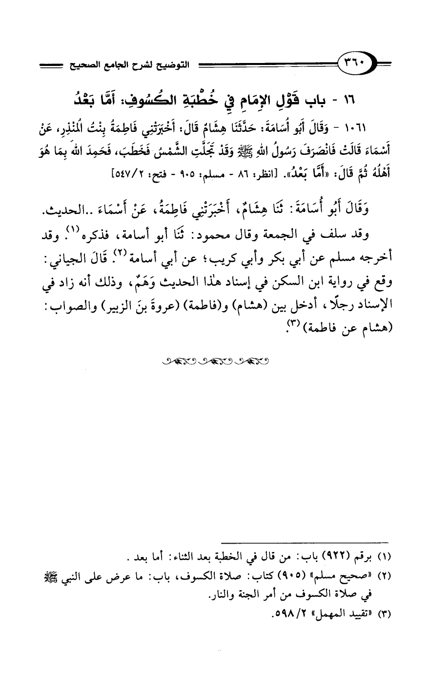 1061 - وَقَالَ أَبُو أُسَامَةَ: حَدَّثَنَا هِشَامٌ قَالَ: أَخْبَرَتْنِي فَاطِمَةُ بِنْتُ المُنْذِرِ، عَنْ أَسْمَاءَ قَالَتْ فَانْصَرَفَ رَسُولُ اللهِ - صلى الله عليه وسلم - وَقَدْ تَجَلَّتِ الشَّمْسُ فَخَطَبَ، فَحَمِدَ اللهَ بِمَا هُوَ أَهْلُهُ ثُمَّ قَالَ: "أَمَّا بَعْدُ". [انظر: 86 - مسلم: 905 - فتح: 2/ 547]