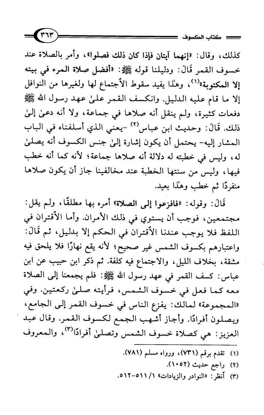 قَالَ: وقوله: "فافزعوا إلى الصلاة" أمره بها مطلقًا، ولم يقل: مجتمعين، فوجب أن يستوي في ذلك الأمران. وأما الاقتران في اللفظ فلا يوجب عندنا الاقتران في الحكم إلا بدليل، ثم قَالَ: واعتبارهم بكسوف الشمس غير صحيح؛ لأنه يقع نهارًا فلا يلحق فيه مشقة، بخلاف الليل، والاجتماع فيه كلفة. ثم ذكر ابن حبيب عن ابن عباس: كسف القمر في عهد رسول الله - صلى الله عليه وسلم -: فلم يجمعنا إلى الصلاة معه كما فعل في خسوف الشمس، فرأيته صلى ركعتين. وفي "المجموعة" لمالك: يفزع الناس في خسوف القمر إلى الجامع، ويصلون أفرادًا. وأجاز أشهب الجمع لكسوف القمر. وقال عبد العزيز: هي كصلاة خسوف الشمس وتصلى أفرادًا (¬3)، والمعروف
