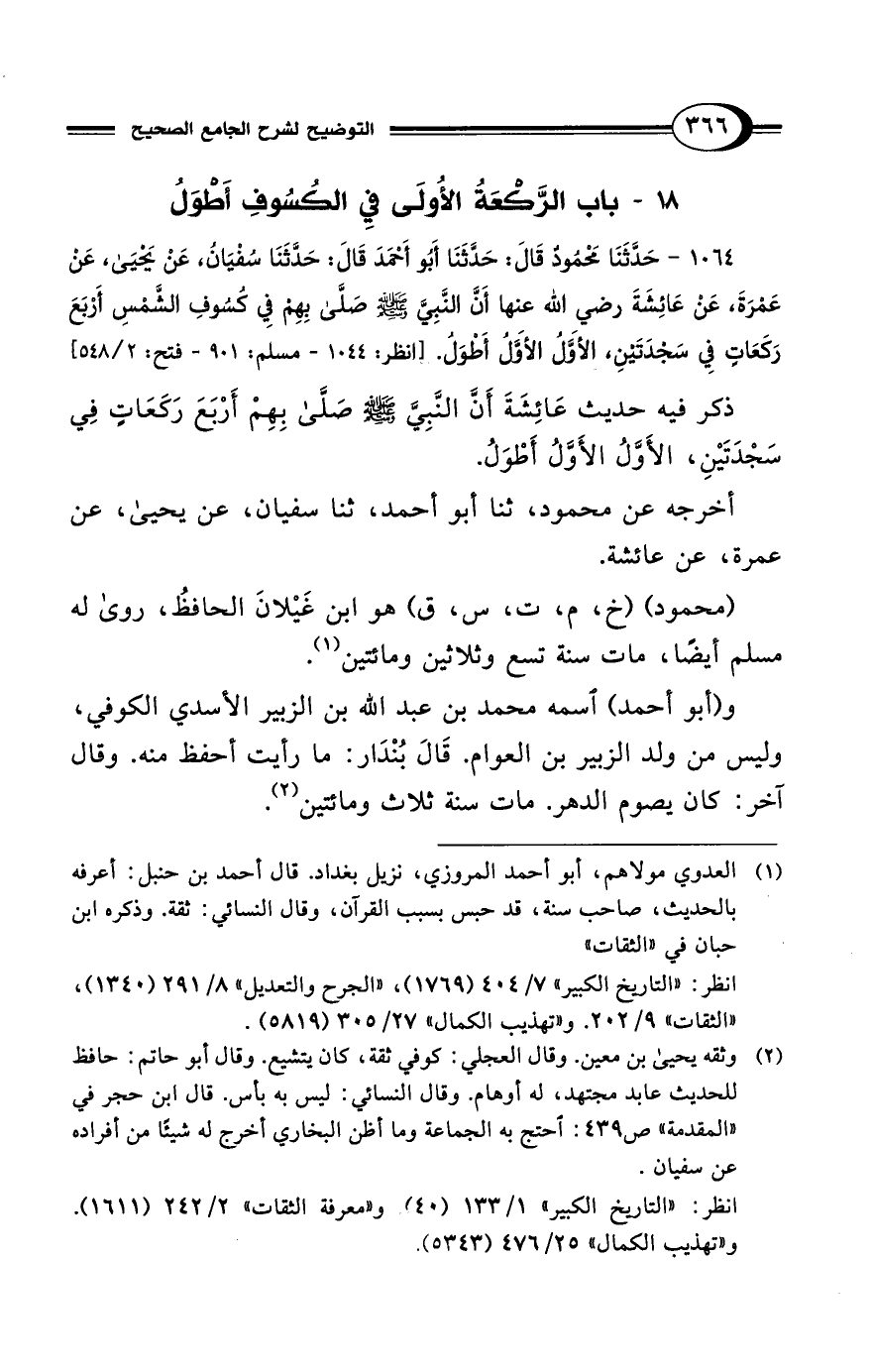 1064 - حَدَّثَنَا مَحْمُودٌ قَالَ: حَدَّثَنَا أَبُو أَحْمَدَ قَالَ: حَدَّثَنَا سُفْيَانُ، عَنْ يَحْيَى، عَنْ عَمْرَةَ، عَنْ عَائِشَةَ رضي الله عنها أَنَّ النَّبِيَّ - صلى الله عليه وسلم - صَلَّى بِهِمْ فِي كُسُوفِ الشَّمْسِ أَرْبَعَ رَكَعَاتٍ فِي سَجْدَتَيْنِ، الأَوَّلُ الأَوَّلُ أَطْوَلُ. [انظر: 1044 - مسلم: 901 - فتح: 2/ 548]
