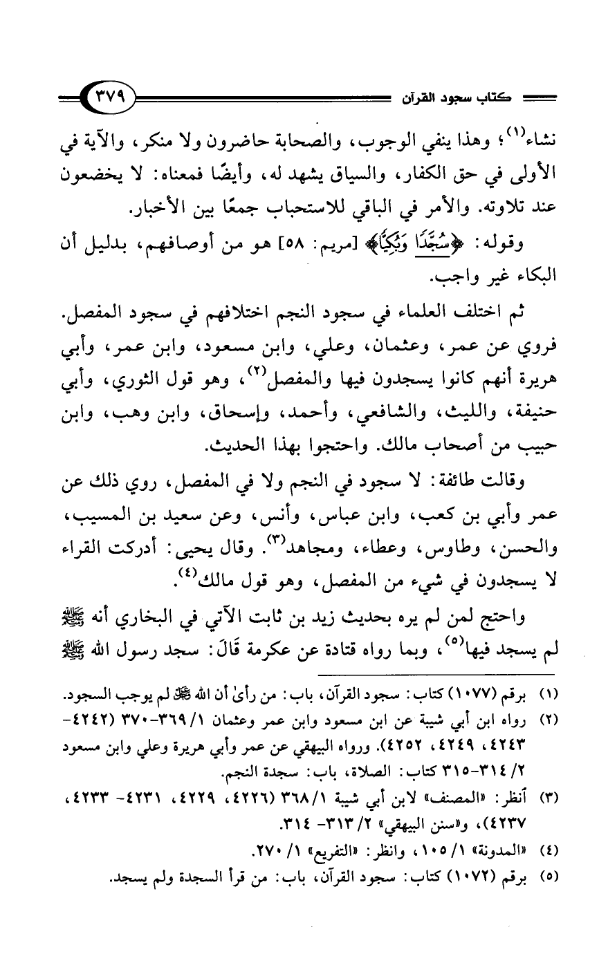 (¬2) رواه ابن أبي شيبة عن ابن مسعود وابن عمر وعثمان 1/ 369 - 370 (4242 - 4243، 4249، 4252). ورواه البيهقي عن عمر وأبي هريرة وعلي وابن مسعود 2/ 314 - 315 كتاب: الصلاة، باب: سجدة النجم.