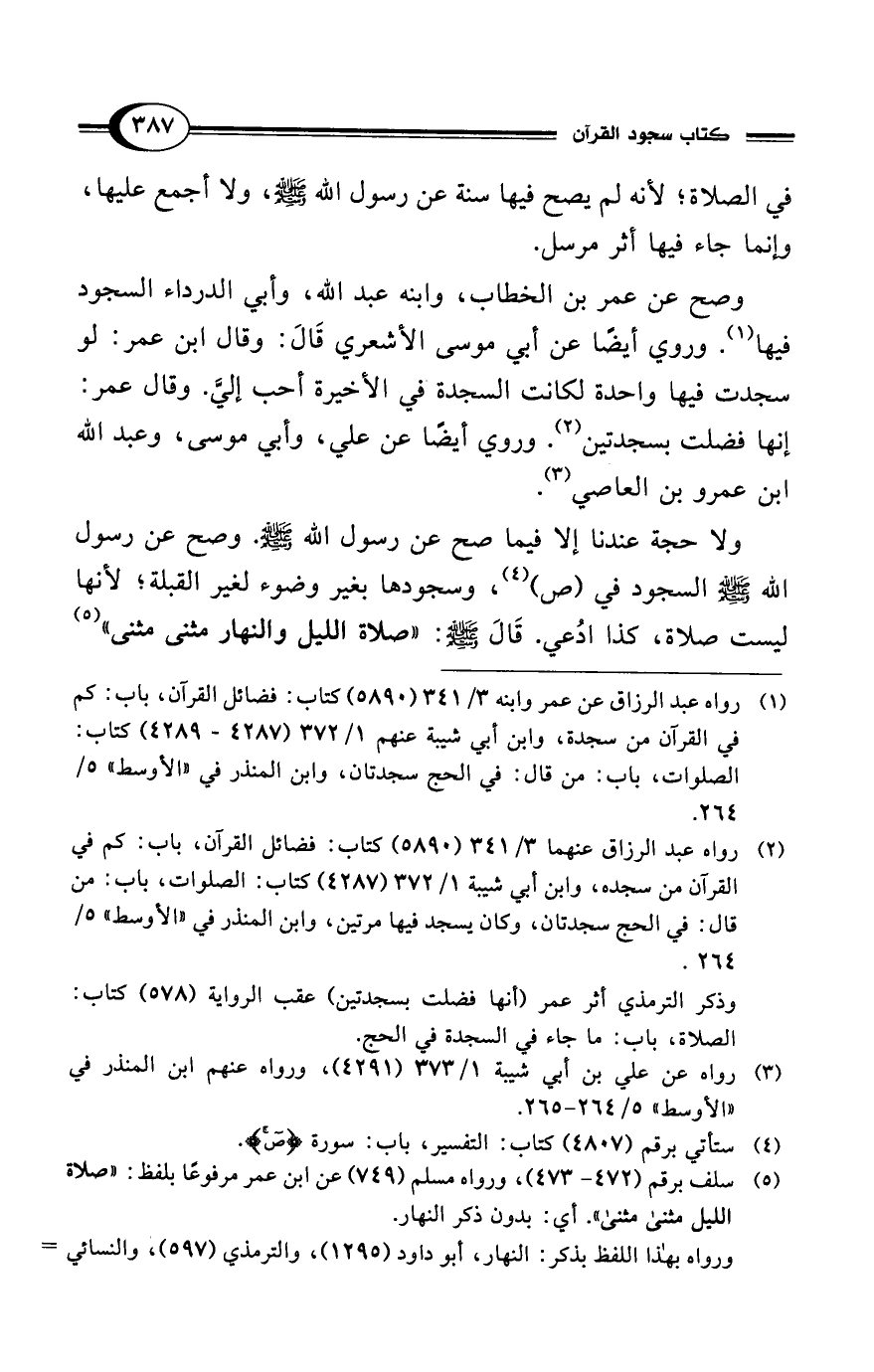 (¬1) رواه عبد الرزاق عن عمر وابنه 3/ 341 (5890) كتاب: فضائل القرآن، باب: كم في القرآن من سجدة، وابن أبي شيبة عنهم 1/ 372 (4287 - 4289) كتاب: الصلوات، باب: من قال: في الحج سجدتان، وابن المنذر في "الأوسط" 5/ 264.