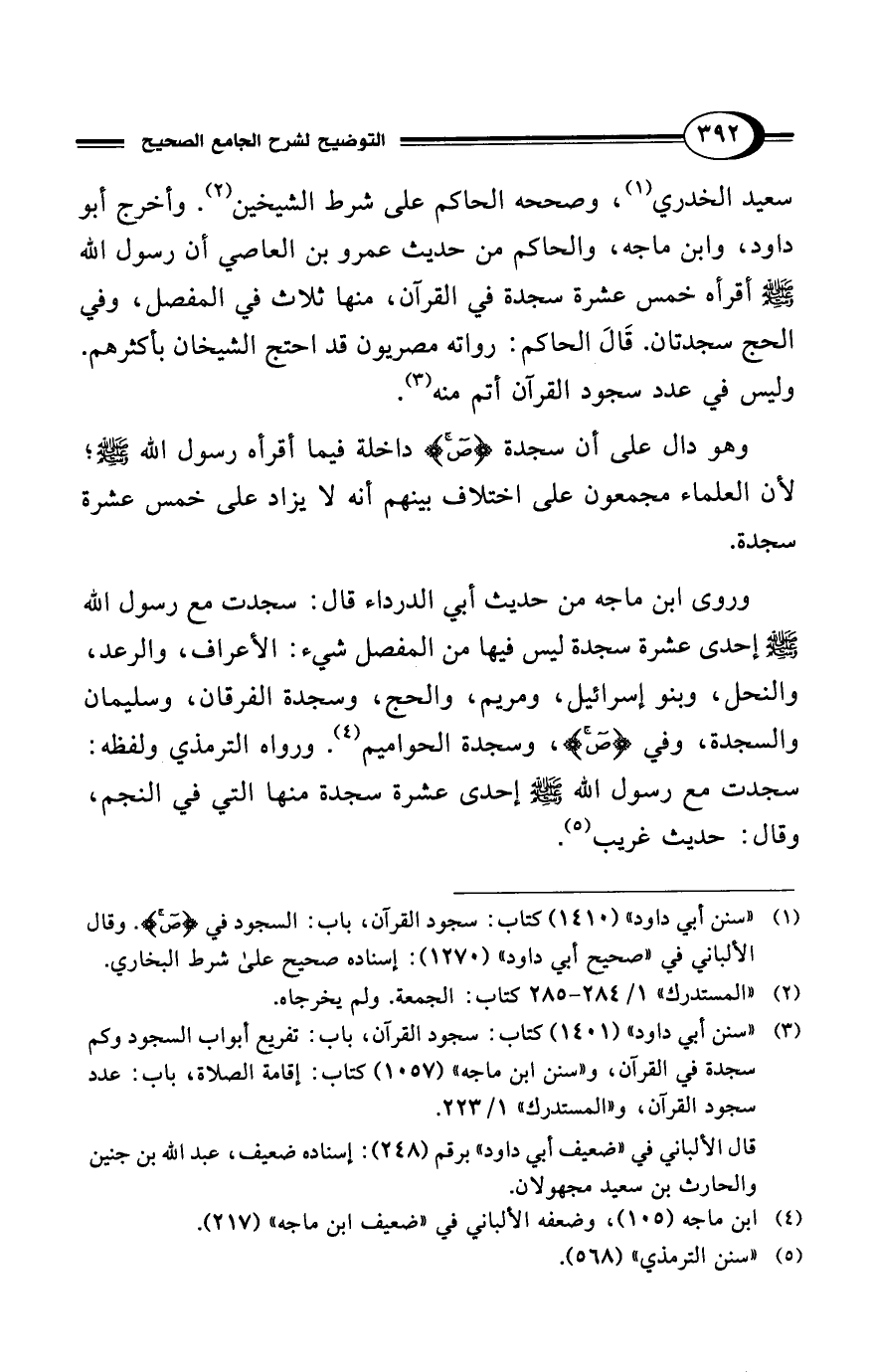 (¬3) "سنن أبي داود" (1401) كتاب: سجود القرآن، باب: تفريع أبواب السجود وكم سجدة في القرآن، و"سنن ابن ماجه" (1057) كتاب: إقامة الصلاة، باب: عدد سجود القرآن، و"المستدرك" 1/ 223.