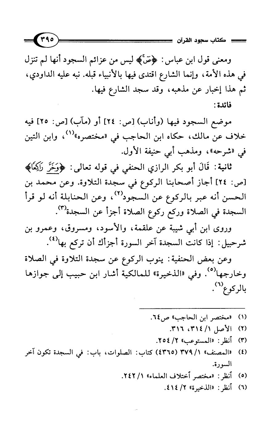 ثانية: قَالَ أبو بكر الرازي الحنفي في قوله تعالى: {وَخَرَّ رَاكِعًا} [ص: 24] أجاز أصحابنا الركوع في سجدة التلاوة. وعن محمد بن الحسن أنه عبر بالركوع عن السجود (¬2)، وعن الحنابلة أنه لو قرأ السجدة في الصلاة وركع ركوع الصلاة أجزأ عن السجدة (¬3).