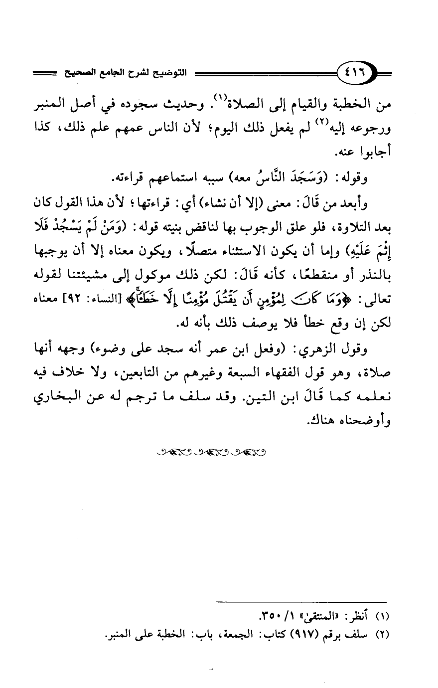 من الخطبة والقيام إلى الصلاة (¬1). وحديث سجوده في أصل المنبر ورجوعه إليه (¬2) لم يفعل ذلك اليوم؛ لأن الناس عمهم علم ذلك، كذا أجابوا عنه.