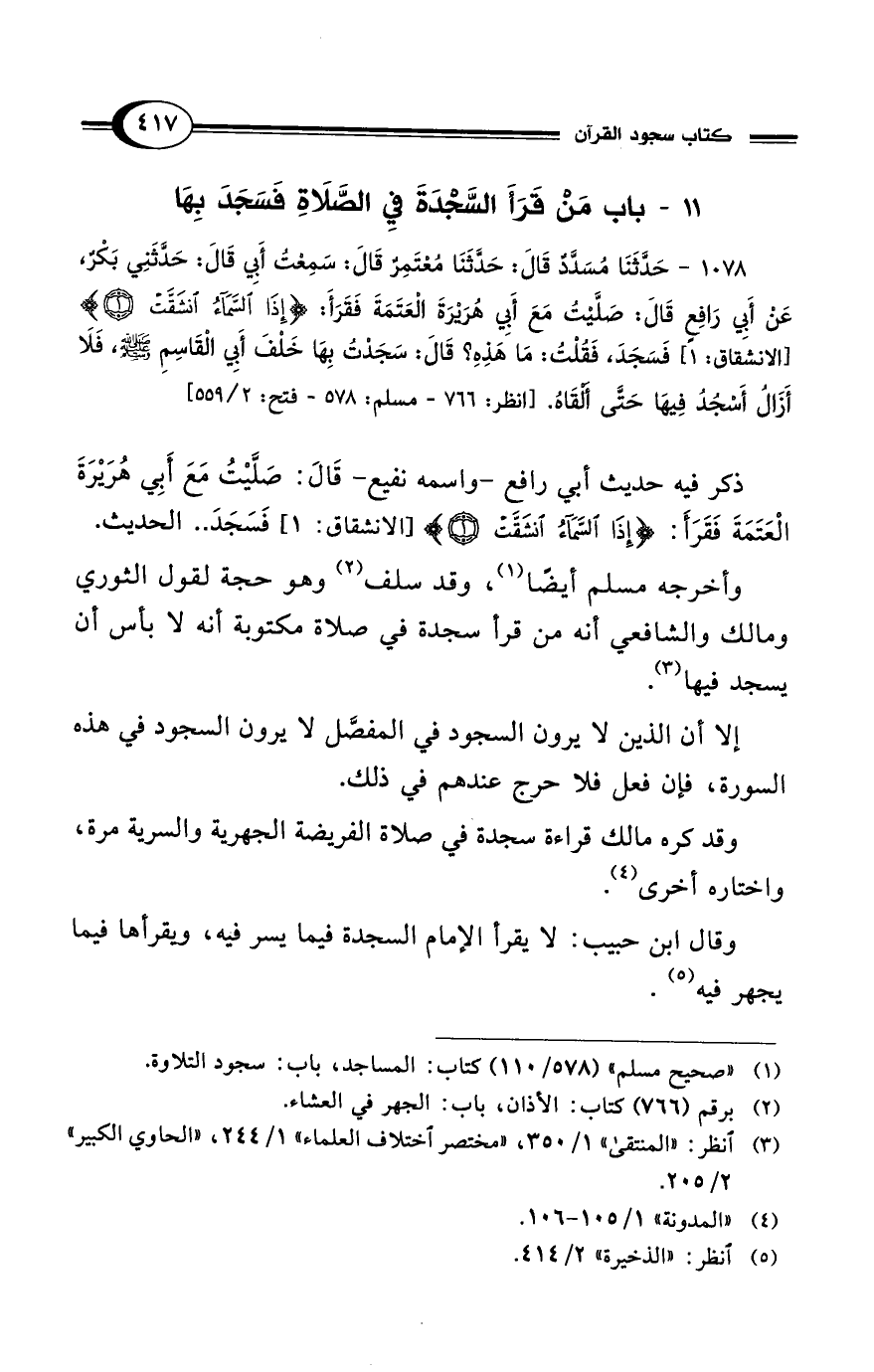 1078 - حَدَّثَنَا مُسَدَّدٌ قَالَ: حَدَّثَنَا مُعْتَمِرٌ قَالَ: سَمِعْتُ أَبِي قَالَ: حَدَّثَنِي بَكْرٌ عَنْ أَبِي رَافِعٍ قَالَ: صَلَّيْتُ مَعَ أَبِي هُرَيْرَةَ العَتَمَةَ فَقَرَأَ: {إِذَا السَّمَاءُ انْشَقَّتْ (1)} [الانشقاق: 1] فَسَجَدَ، فَقُلْتُ: مَا هَذِهِ؟ قَالَ: سَجَدْتُ بِهَا خَلْفَ أَبِي القَاسِمِ - صلى الله عليه وسلم -، فَلاَ أَزَالُ أَسْجُدُ فِيهَا حَتَّى أَلْقَاهُ. [انظر: 766 - مسلم: 578 - فتح: 2/ 559]