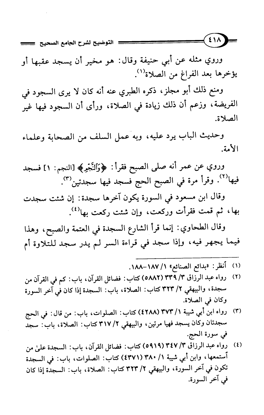 (¬4) رواه عبد الرزاق 3/ 347 (5919) كتاب: فضائل القرآن، باب: السجدة على من استمعها، وابن أبي شيبة 1/ 380 (4371) كتاب: الصلوات، باب: في السجدة تكون في آخر السورة، والبيهقي 2/ 323 كتاب: الصلاة، باب: السجدة إذا كان في آخر السورة.