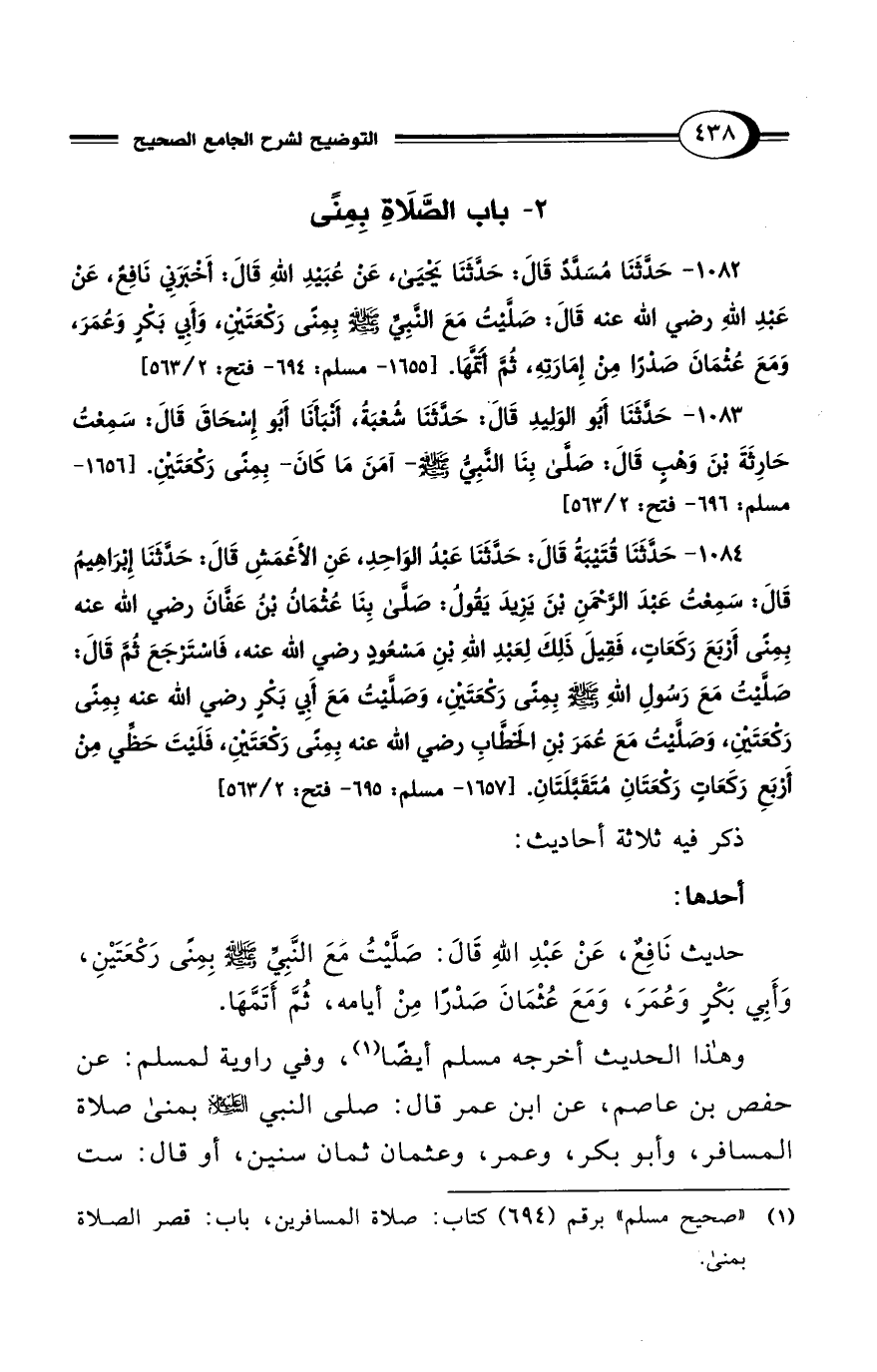 1082 - حَدَّثَنَا مُسَدَّدٌ قَالَ: حَدَّثَنَا يَحْيَى، عَنْ عُبَيْدِ اللهِ قَالَ: أَخْبَرَنِي نَافِعٌ، عَنْ عَبْدِ اللهِ رضي الله عنه قَالَ: صَلَّيْتُ مَعَ النَّبِيِّ - صلى الله عليه وسلم - بِمِنًى رَكْعَتَيْنِ، وَأَبِي بَكْرٍ وَعُمَرَ، وَمَعَ عُثْمَانَ صَدْرًا مِنْ إِمَارَتِهِ، ثُمَّ أَتَمَّهَا. [1655 - مسلم: 694 - فتح: 2/ 563]