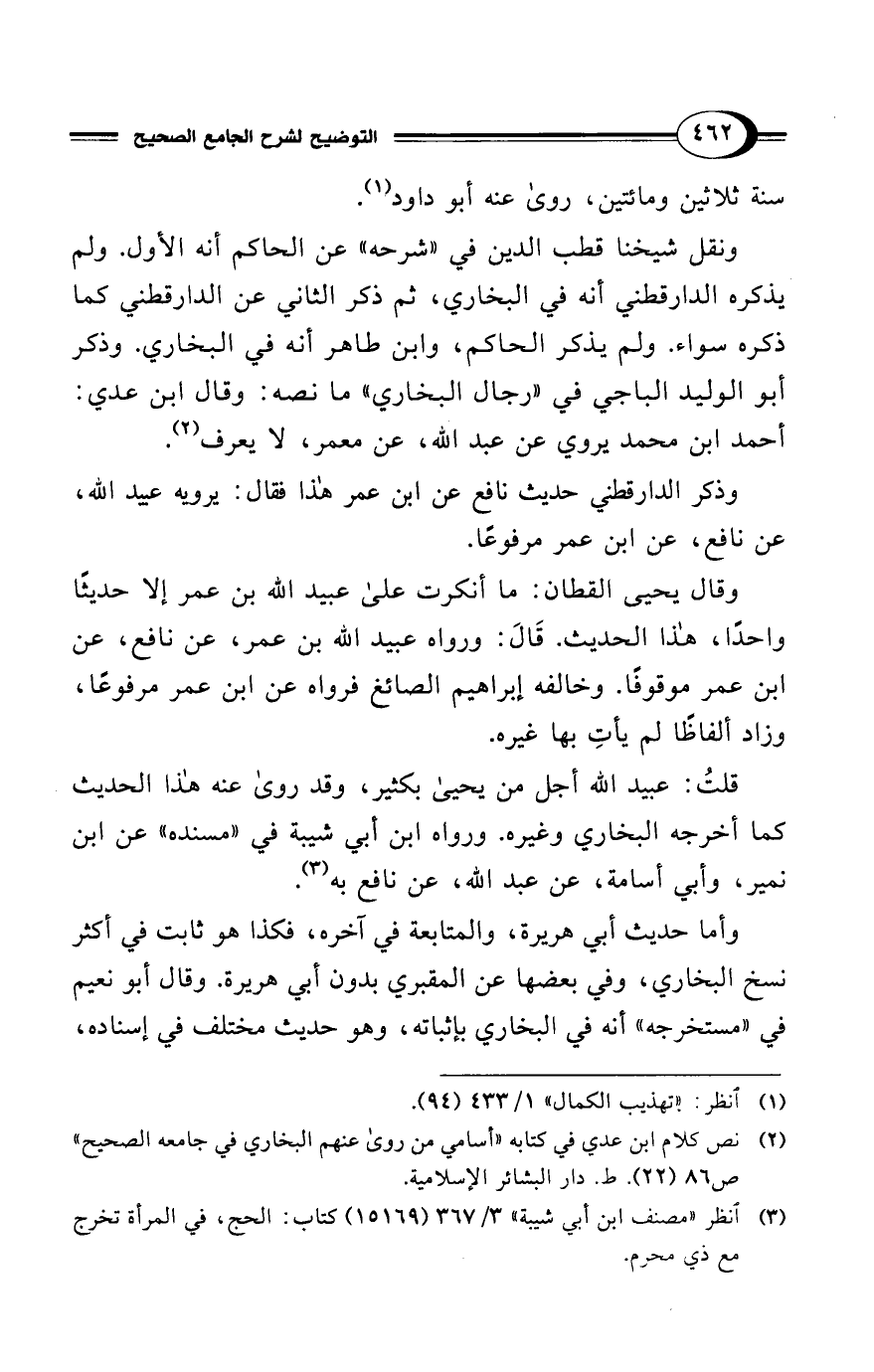 قلتُ: عبيد الله أجل من يحيى بكثير، وقد روى عنه هذا الحديث كما أخرجه البخاري وغيره. ورواه ابن أبي شيبة في "مسنده" عن ابن نمير، وأبي أسامة، عن عبد الله، عن نافع به (¬3).