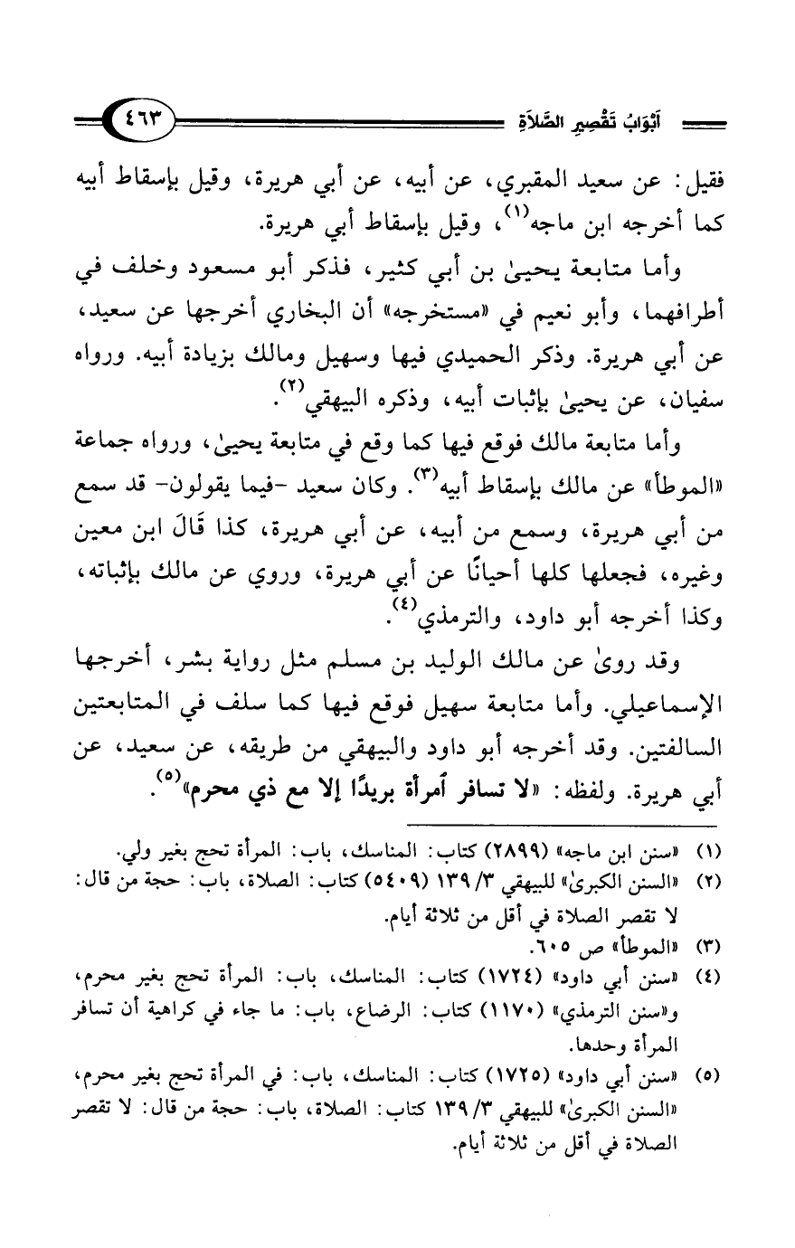 (¬5) "سنن أبي داود" (1725) كتاب: المناسك، باب: في المرأة تحج بغير محرم، "السنن الكبرى" للبيهقي 3/ 139 كتاب: الصلاة، باب: حجة من قال: لا تقصر الصلاة في أقل من ثلاثة أيام.