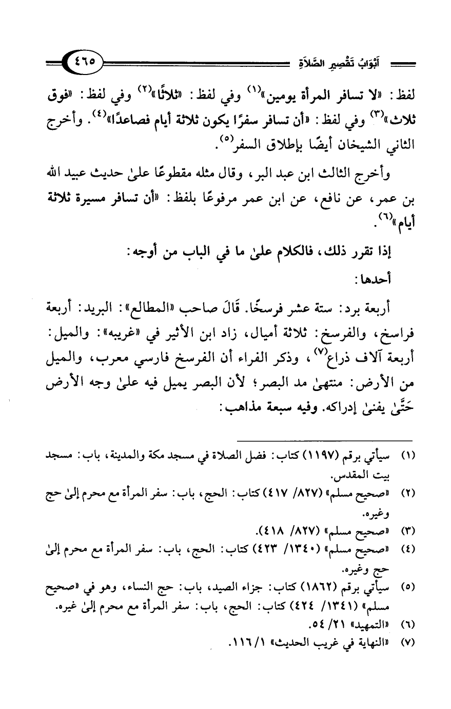 لفظ: "لا تسافر المرأة يومين" (¬1) وفي لفظ: "ثلًاثا" (¬2) وفي لفظ: "فوق ثلاث" (¬3) وفي لفظ: "أن تسافر سفرًا يكون ثلاثة أيام فصاعدًا" (¬4). وأخرج الثاني الشيخان أيضًا بإطلاق السفر (¬5).