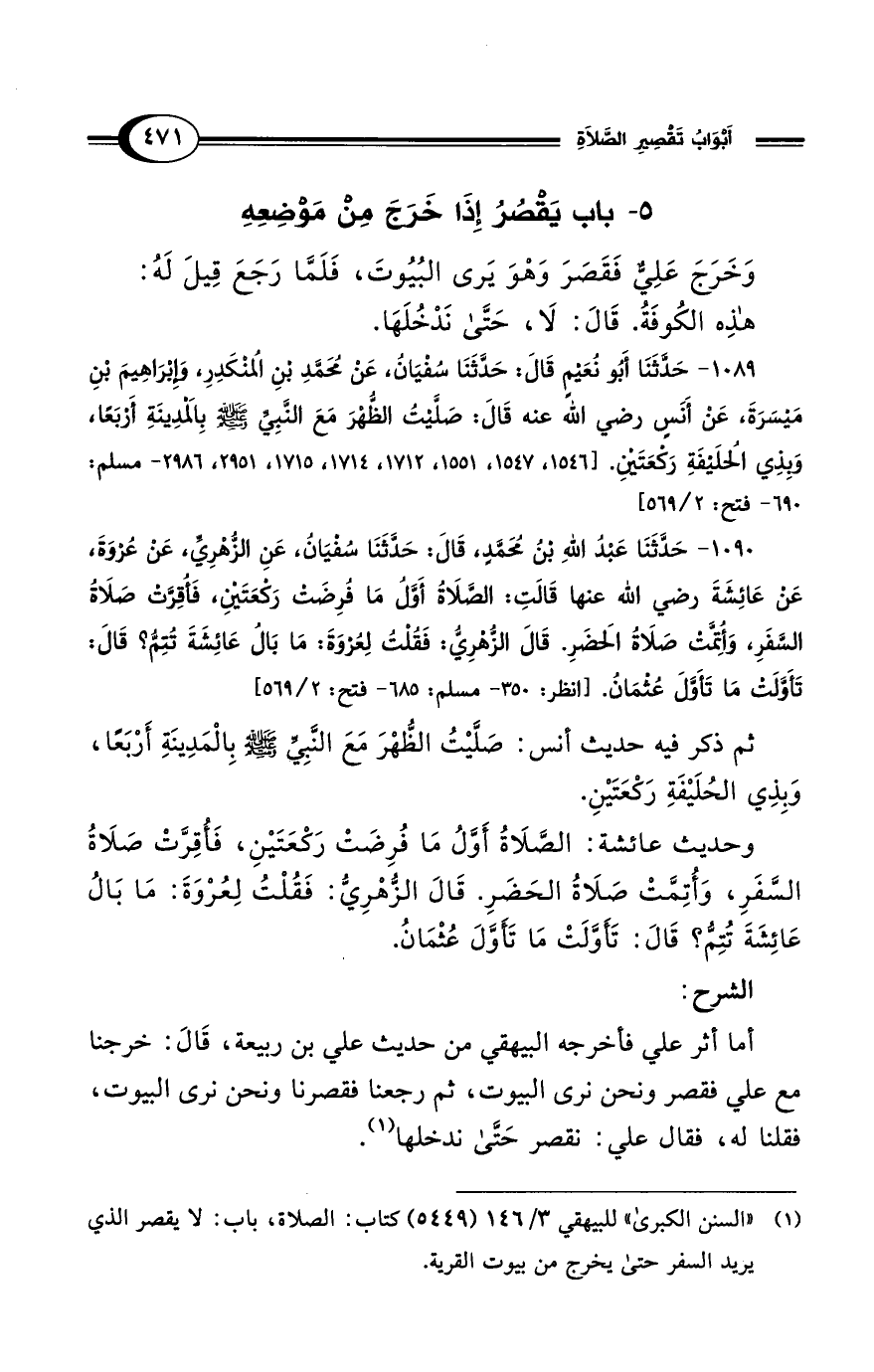 (¬1) "السنن الكبرى" للبيهقي 3/ 146 (5449) كتاب: الصلاة، باب: لا يقصر الذي يريد السفر حتى يخرج من بيوت القرية.