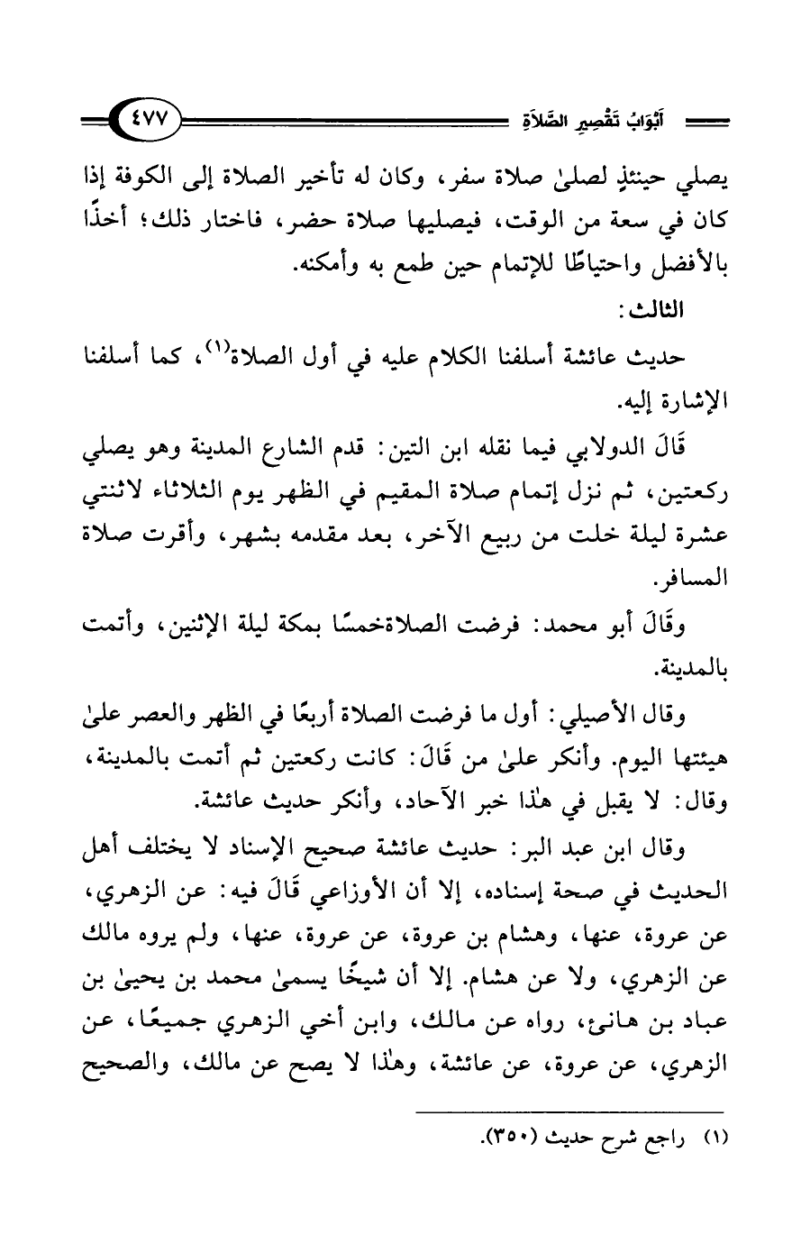 قَالَ الدولابي فيما نقله ابن التين: قدم الشارع المدينة وهو يصلي ركعتين، ثم نزل إتمام صلاة المقيم في الظهر يوم الثلاثاء لاثنتي عشرة ليلة خلت من ربيع الآخر، بعد مقدمه بشهر، وأقرت صلاة المسافر.