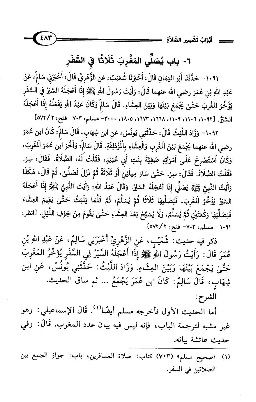 1091 - حَدَّثَنَا أَبُو اليَمَانِ قَالَ: أَخْبَرَنَا شُعَيْبٌ، عَنِ الزُّهْرِيِّ قَالَ: أَخْبَرَنِي سَالِمٌ، عَنْ عَبْدِ اللهِ بْنِ عُمَرَ رضي الله عنهما قَالَ: رَأَيْتُ رَسُولَ اللهِ - صلى الله عليه وسلم - إِذَا أَعْجَلَهُ السَّيْرُ فِي السَّفَرِ يُؤَخِّرُ المَغْرِبَ حَتَّى يَجْمَعَ بَيْنَهَا وَبَيْنَ العِشَاءِ. قَالَ سَالِمٌ وَكَانَ عَبْدُ اللهِ يَفْعَلُهُ إِذَا أَعْجَلَهُ السَّيْرُ. [1092، 1106، 1109، 1668، 1673، 1805، 3000 - مسلم: 703 - فتح: 2/ 572]