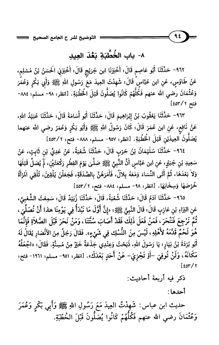 962 - حَدَّثَنَا أَبُو عَاصِمٍ قَالَ: أَخْبَرَنَا ابْنُ جُرَيْجٍ قَالَ: أَخْبَرَنِي الحَسَنُ بْنُ مُسْلِمٍ، عَنْ طَاوُسٍ عَنِ ابْنِ عَبَّاسٍ قَالَ: شَهِدْتُ العِيدَ مَعَ رَسُولِ اللهِ - صلى الله عليه وسلم - وَأَبِي بَكْرٍ وَعُمَرَ وَعُثْمَانَ رضي الله عنهم فَكُلُّهُمْ كَانُوا يُصَلُّونَ قَبْلَ الخُطْبَةِ. [انظر: 98 - مسلم: 884 - فتح 2/ 453]