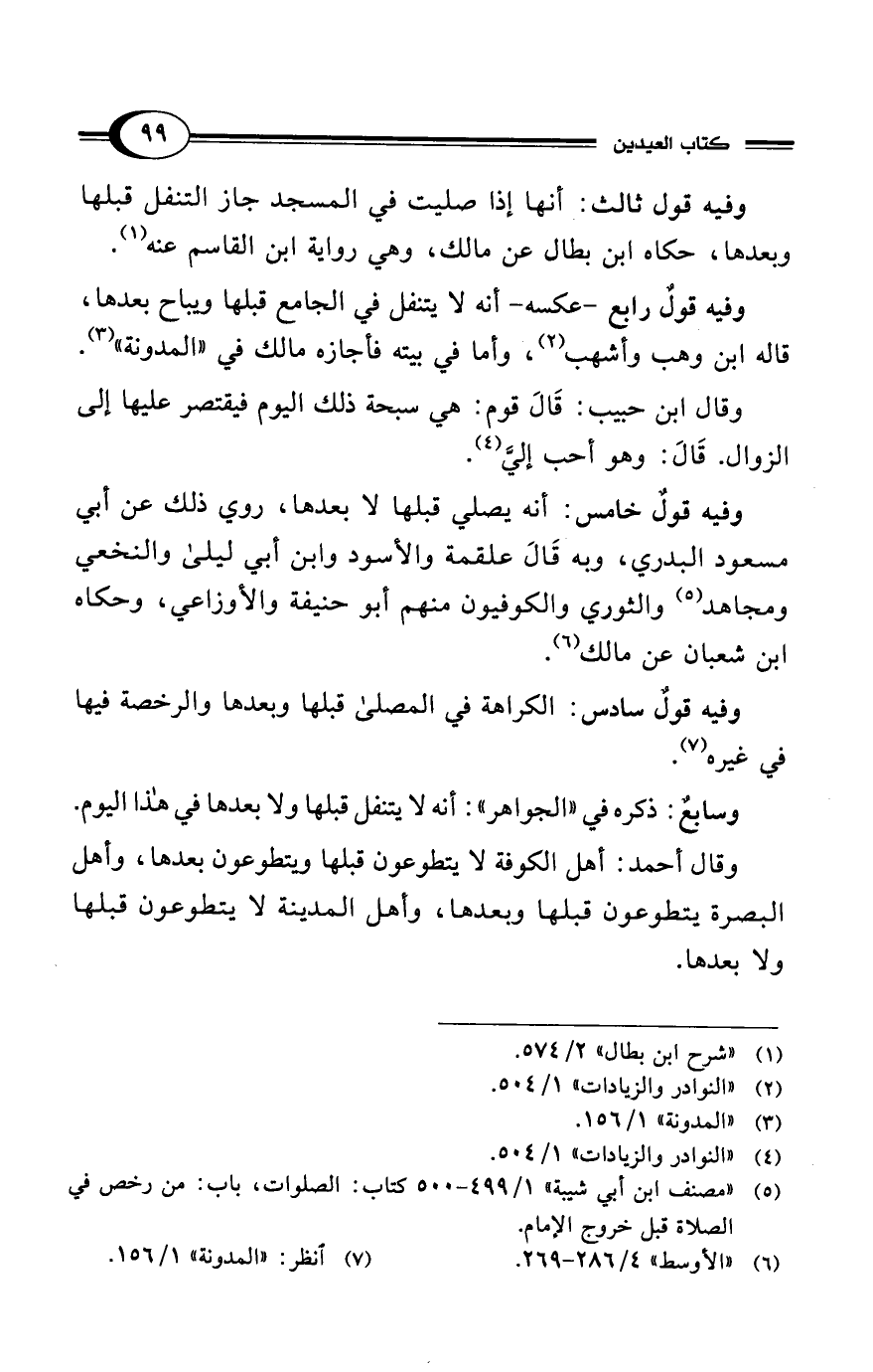 وفيه قولٌ سادس: الكراهة في المصلى قبلها وبعدها والرخصة فيها في غيره (¬7).