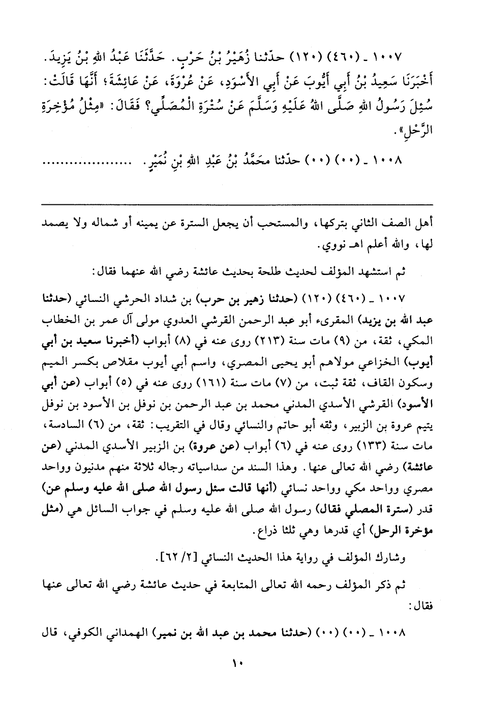 ١٠٠٧ - (٤٦٠) (١٢٠) (حدثنا زهير بن حرب) بن شداد الحرشي النسائي (حدثنا عبد الله بن يزيد) المقرئ أبو عبد الرحمن القرشي العدوي مولى آل عمر بن الخطاب المكي، ثقة، من (٩) مات سنة (٢١٣) روى عنه في (٨) أبواب (أخبرنا سعيد بن أبي أيوب) الخزاعي مولاهم أبو يحيى المصري، واسم أبي أيوب مقلاص بكسر الميم وسكون القاف، ثقة ثبت، من (٧) مات سنة (١٦١) روى عنه في (٥) أبواب (عن أبي الأسود) القرشي الأسدي المدني محمد بن عبد الرحمن بن نوفل بن الأسود بن نوفل يتيم عروة بن الزبير، وثقه أبو حاتم والنسائي وقال في التقريب: ثقة، من (٦) السادسة، مات سنة (١٣٣) روى عنه في (٦) أبواب (عن عروة) بن الزبير الأسدي المدني (عن عائشة) رضي الله تعالى عنها. وهذا السند من سداسياته رجاله ثلاثة منهم مدنيون وواحد مصري وواحد مكي وواحد نسائي (أنها قالت سئل رسول الله صلى الله عليه وسلم عن) قدر (سترة المصلي فقال) رسول الله صلى الله عليه وسلم في جواب السائل هي (مثل مؤخرة الرحل) أي قدرها وهي ثلثا ذراع.