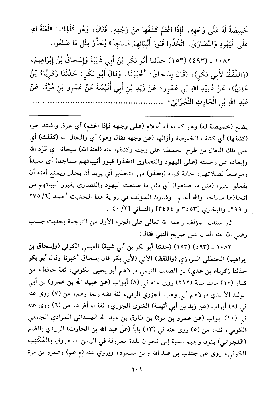 ١٠٨٢ - (٤٩٣) (١٥٣) (حدثنا أبو بكر بن أبي شيبة) العبسي الكوفي (وإسحاق بن إبراهيم) الحنطلي المروزي (واللفظ) الآتي (لأبي بكر قال إسحاق أخبرنا وقال أبو بكر حدثنا زكرياء بن عدي) بن الصلت التيمي مولاهم أبو يحيى الكوفي، ثقة حافظ، من كبار (١٠) مات سنة (٢١٢) روى عنه في (٨) أبواب (عن عبيد الله بن عمرو) بن أبي الوليد الأسدي مولاهم أبي وهب الجزري الرقي، ثقة فقيه ربما وهم، من (٧) روى عنه في (٨) أبواب (عن زيد بن أبي أنيسة) الغنوي الجزري، ثقة له أفراد، من (٦) روى عنه في (١٠) أبواب (عن عمرو بن مرة) بن طارق بن عبد الله الهمداني المرادي الجملي الكوفي، ثقة، من (٥) روى عنه في (١٣) بابا (عن عبد الله بن الحارث) الزبيدي بالضم (النجراني) بنون وجيم نسبة إلى نجران بلدة معروفة في اليمن المعروفِ بالمُكْتِب الكوفي، روى عن جندب بن عبد الله وابن مسعود، ويروي عنه (م عم) وعمرو بن مرة
