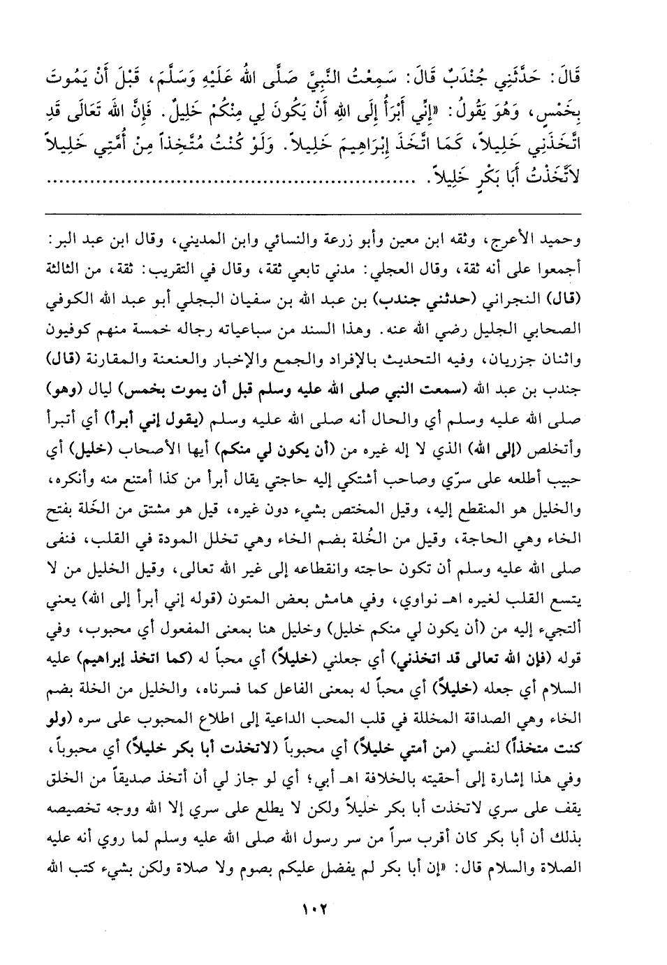 قَال: حَدَّثَنِي جُنْدَبٌ قَال: سَمِعْتُ النَّبِيَّ صَلَّى الله عَلَيهِ وَسَلَّمَ، قَبْلَ أنْ يَمُوتَ بِخَمْسٍ، وَهُوَ يَقُولُ: "إِنِّي أَبْرَأُ إِلَى الله أَنْ يَكُونَ لِي مِنْكُمْ خَلِيلٌ. فَإِن الله تَعَالى قَدِ اتَّخَذَنِي خَلِيلًا، كَمَا اتَّخَذَ إِبْرَاهِيمَ خَلِيلًا. وَلَوْ كُنْتُ مُتَّخِذًا مِنْ أُمَّتِي خَلِيلًا لاتَّخَذتُ أَبَا بَكْرٍ خَلِيلًا