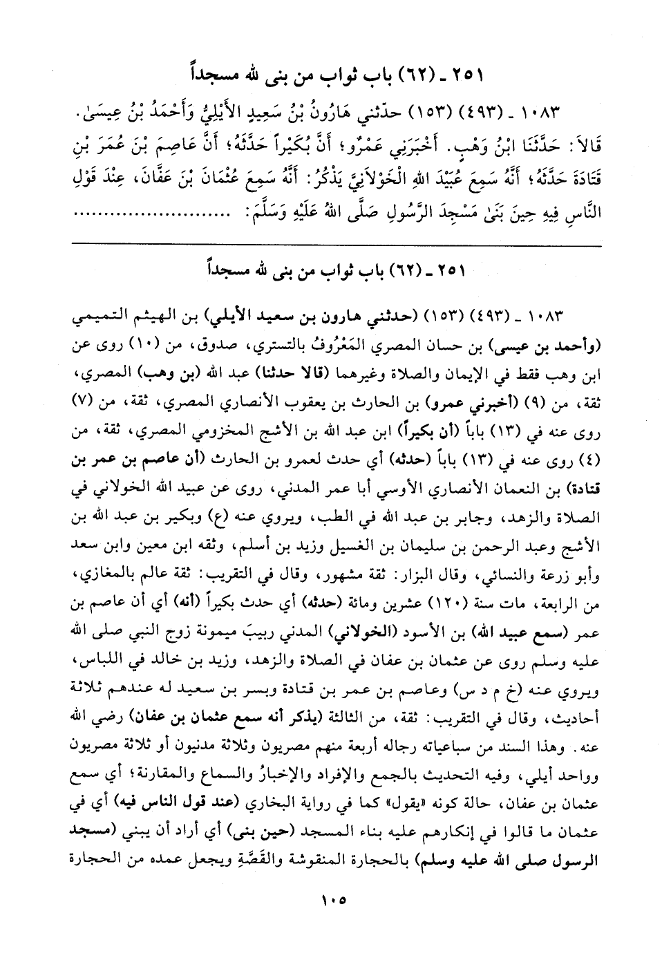 ١٠٨٣ - (٤٩٣) (١٥٣) (حدثني هارون بن سعيد الأيلي) بن الهيثم التميمي (وأحمد بن عيسى) بن حسان المصري المَعْرُوفُ بالتستري، صدوق، من (١٠) روى عن ابن وهب فقط في الإيمان والصلاة وغيرهما (قالا حدثنا) عبد الله (بن وهب) المصري، ثقة، من (٩) (أخبرني عمرو) بن الحارث بن يعقوب الأنصاري المصري، ثقة، من (٧) روى عنه في (١٣) بابا (أن بكيرًا) ابن عبد الله بن الأشج المخزومي المصري، ثقة، من (٤) روى عنه في (١٣) بابا (حدثه) أي حدث لعمرو بن الحارث (أن عاصم بن عمر بن قتادة) بن النعمان الأنصاري الأوسي أبا عمر المدني، روى عن عبيد الله الخولاني في الصلاة والزهد، وجابر بن عبد الله في الطب، ويروي عنه (ع) وبكير بن عبد الله بن الأشج وعبد الرحمن بن سليمان بن الغسيل وزيد بن أسلم، وثقه ابن معين وابن سعد وأبو زرعة والنسائي، وقال البزار: ثقة مشهور، وقال في التقريب: ثقة عالم بالمغازي، من الرابعة، مات سنة (١٢٠) عشرين ومائة (حدثه) أي حدث بكيرًا (أنه) أي أن عاصم بن عمر (سمع عبيد الله) بن الأسود (الخولاني) المدني ربيبَ ميمونة زوج النبي صلى الله عليه وسلم روى عن عثمان بن عفان في الصلاة والزهد، وزيد بن خالد في اللباس، ويروي عنه (خ م د س) وعاصم بن عمر بن قتادة وبسر بن سعيد له عندهم ثلاثة أحاديث، وقال في التقريب: ثقة، من الثالثة (يذكر أنه سمع عثمان بن عفان) رضي الله عنه. وهذا السند من سباعياته رجاله أربعة منهم مصريون وثلاثة مدنيون أو ثلاثة مصريون وواحد أيلي، وفيه التحديث بالجمع والإفراد والإخبارُ والسماع والمقارنة؛ أي سمع عثمان بن عفان، حالة كونه "يقول" كما في رواية البخاري (عند قول الناس فيه) أي في عثمان ما قالوا في إنكارهم عليه بناء المسجد (حين بنى) أي أراد أن يبني (مسجد الرسول صلى الله عليه وسلم) بالحجارة المنقوشة والقَصَّةِ ويجعل عمده من الحجارة