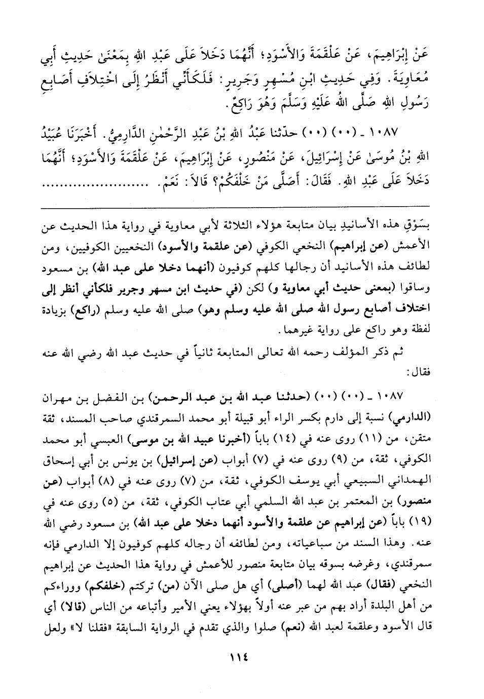 ١٠٨٧ - (٠٠) (٠٠) حدَّثنا عَبْدُ اللهِ بْنُ عَبْدِ الرَّحْمَّنِ الدَّارِمِيُّ. أَخْبَرَنَا عُبَيدُ اللهِ بْنُ مُوسَى عَنْ إِسْرَائِيلَ، عَنْ مَنْصُور، عَنْ إِبْرَاهِيمَ، عَنْ عَلْقَمَةَ وَالأَسْوَدِ؛ أَنَّهُمَا دَخَلا عَلَى عَبْدِ اللهِ. فَقَال: أَصَلَّى مَنْ خَلْفَكُمْ؟ قَالا: نَعَمْ