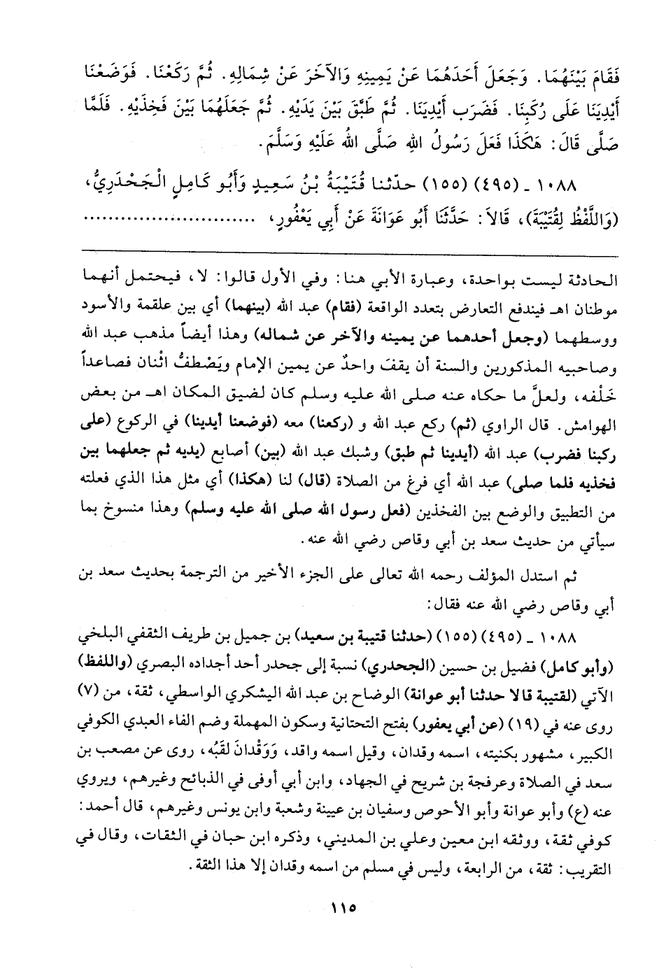 فَقَامَ بَينَهُمَا. وَجَعَلَ أَحَدَهُمَا عَنْ يَمِينِهِ وَالآخَرَ عَنْ شِمَالِهِ. ثُمَّ رَكَعْنَا. فَوَضَعْنَا أَيدِيَنَا عَلَى رُكَبِنَا. فَضَرَب أَيدِيَنَا. ثُمَّ طَبَّقَ بَينَ يَدَيهِ. ثُمَّ جَعَلَهُمَا بَينَ فَخِذَيهِ. فَلَمَّا صَلَّى قَال: هَكَذَا فَعَلَ رَسُولُ الله صَلَّى الله عَلَيهِ وَسَلَّمَ.