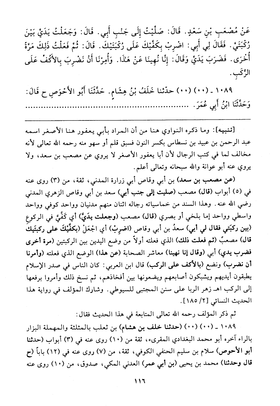عَنْ مُصْعَبِ بنِ سَعْدٍ. قَال: صَلَّيتُ إِلَى جَنْبِ أَبِي. قَال: وَجَعَلْتُ يَدَيَّ بَينَ رُكْبَتَيَّ. فَقَال لِي أَبِي: اضْرِبْ بِكَفَّيكَ عَلَى رُكْبَتَيكَ. قَال: ثُمَّ فَعَلْتُ ذَلِكَ مَرَّةً أُخْرَى. فَضَرَبَ يَدَيَّ وَقَال: إِنَّا نُهِينَا عَنْ هَذَا. وَأُمِرْنَا أنْ نَضرِبَ بِالأكُفِّ عَلَى الرُّكَبِ.