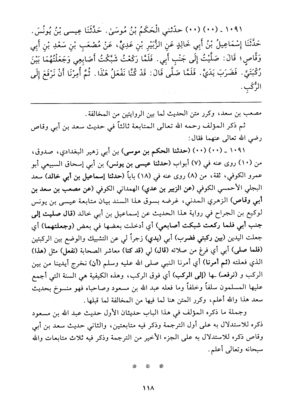 ١٠٩١ - (٠٠) (٠٠) (حدثنا الحكم بن موسى) بن أبي زهير البغدادي، صدوق، من (١٠) روى عنه في (٧) أبواب (حدثنا عيسى بن يونس) بن أبي إسحاق السبيعي أبو عمرو الكوفي، ثقة، من (٨) روى عنه في (١٨) بابا (حدثنا إسماعيل بن أبي خالد) سعد البجلي الأحمسي الكوفي (عن الزبير بن عدي) الهمداني الكوفي (عن مصعب بن سعد بن أبي وقاص) الزهري المدني، غرضه بسوق هذا السند بيان متابعة عيسى بن يونس لوكيع بن الجراح في رواية هذا الحديث عن إسماعيل بن أبي خالد (قال صليت إلى جنب أبي فلما ركعت شبكت أصابعي) أي أدخلت بعضها في بعض (وجعلتهما) أي جعلت اليدين (بين ركبتي فضرب) أبي (يدي) زجرًا لي عن التشبيك والوضع بين الركبتين (فلما صلى) أبي أي فرغ من صلاته (قال) لي (قد كنا) معاشر الصحابة (نفعل) مثل (هذا) الذي فعلته (ثم أمرنا) أي أمرنا النبي صلى الله عليه وسلم (أن) نخرج أيدينا من بين الركب و (نرفعـ) ـها (إلى الركب) أي فوق الركب، وهذه الكيفية هي السنة التي أجمع عليها المسلمون سلفًا وخلفًا وما فعله عبد الله بن مسعود وصاحباه فهو منسوخ بحديث سعد هذا والله أعلم، وكرر المتن هنا لما فيها من المخالفة لما قبلها.