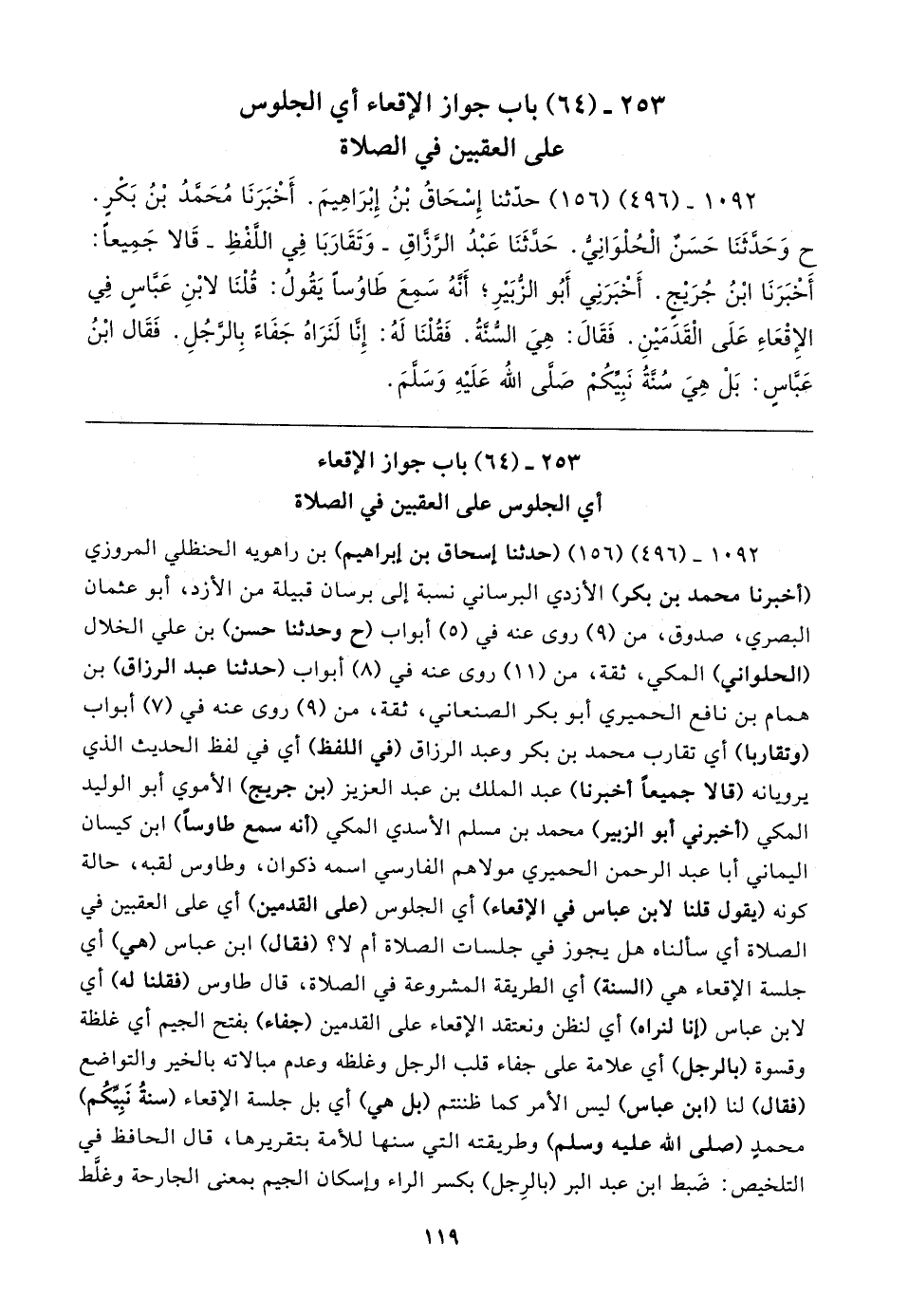 ١٠٩٢ - (٤٩٦) (١٥٦) حدَّثنا إِسْحَاقُ بْنُ إِبْرَاهِيمَ. أَخْبَرَنَا مُحَمَّدُ بْنُ بَكْرٍ. ح وَحَدَّثَنَا حَسَن الْحُلْوَانِيُّ. حَدَّثَنَا عَبْدُ الرَّزَّاقِ -وَتَقَارَبَا فِي اللَّفْظِ- قَالا جَمِيعًا: أَخْبَرَنَا ابْنُ جُرَيجٍ. أَخْبَرَنِي أَبُو الزُّبَيرِ؛ أَنَّهُ سَمِعَ طَاوُسًا يَقُولُ: قُلْنَا لابْنِ عَبَّاسٍ فِي الإِقْعَاءِ عَلَى الْقَدَمَينِ. فَقَال: هِيَ السُّنَّةُ. فَقُلْنَا لَهُ: إِنَّا لَنَرَاهُ جَفَاءً بِالرَّجُلِ. فَقَال ابْنُ عَبَّاسٍ: بَلْ هِيَ سُنَّةُ نَبِيِّكُمْ صَلَّى الله عَلَيهِ وَسَلَّمَ