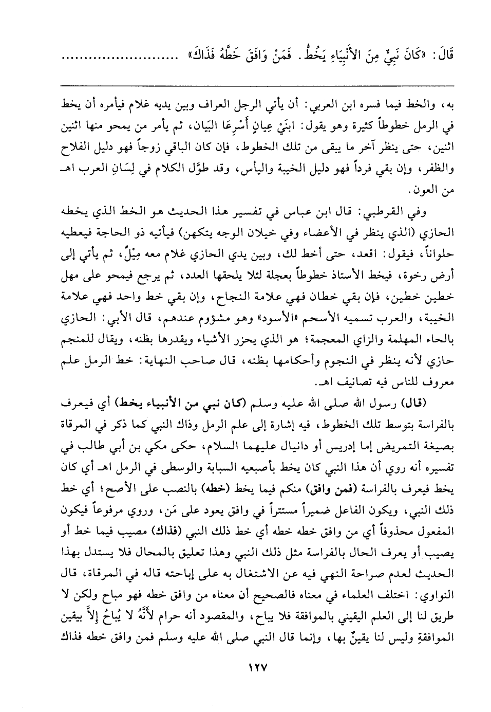 وفي القرطبي: قال ابن عباس في تفسير هذا الحديث هو الخط الذي يخطه الحازي (الذي ينظر في الأعضاء وفي خيلان الوجه يتكهن) فيأتيه ذو الحاجة فيعطيه حلوانًا، فيقول: اقعد، حتى أخط لك، وبين يدي الحازي غلام معه مِيلٌ، ثم يأتي إلى أرض رخوة، فيخط الأستاذ خطوطًا بعجلة لئلا يلحقها العدد، ثم يرجع فيمحو على مهل خطين خطين، فإن بقي خطان فهي علامة النجاح، وإن بقي خط واحد فهي علامة الخيبة، والعرب تسميه الأسحم "الأسود" وهو مشؤوم عندهم، قال الأبي: الحازي بالحاء المهلمة والزاي المعجمة؛ هو الذي يحزر الأشياء ويقدرها بظنه، ويقال للمنجم حازي لأنه ينظر في النجوم وأحكامها بظنه، قال صاحب النهاية: خط الرمل علم معروف للناس فيه تصانيف اهـ.